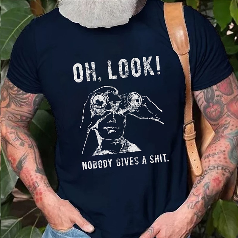 The standout feature of this T-shirt is the bold, playful graphic print on the front, showcasing a humorous illustration with the text "OH, LOOK!" and "NOBODY GIVES A SHIT." It also cleverly incorporates a cartoon character peering through binoculars, adding a touch of irreverent humor.
