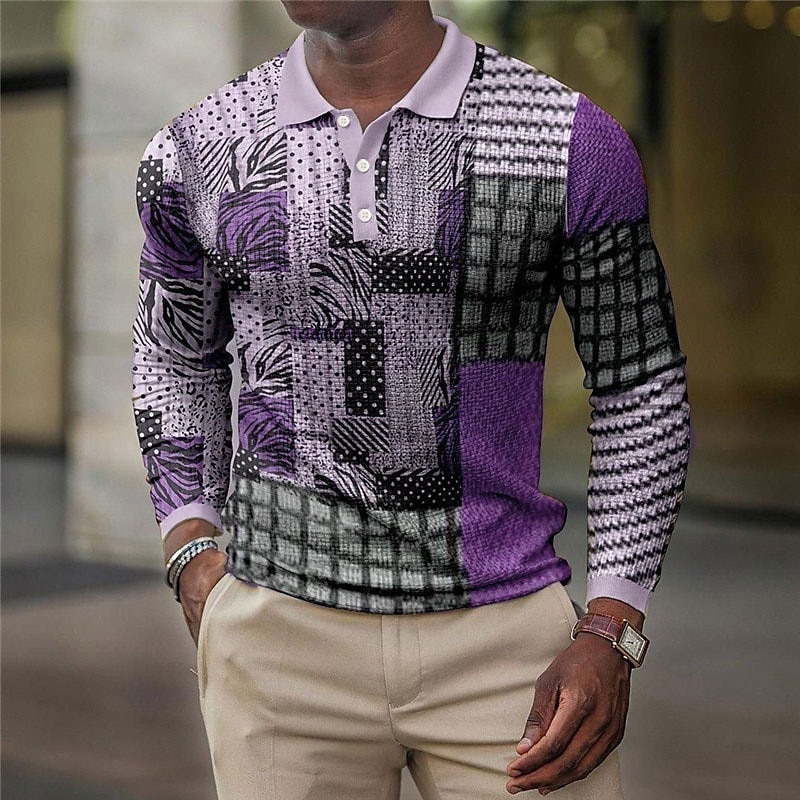 Men's Plaid Waffle Polo Shirts Golf Shirt Long Sleeve Polo Shirts Collared Shirts Vintage Casual Vacation Wear Formal Wear Festival Wear 3D Print Buttons Red Blue Purple 15