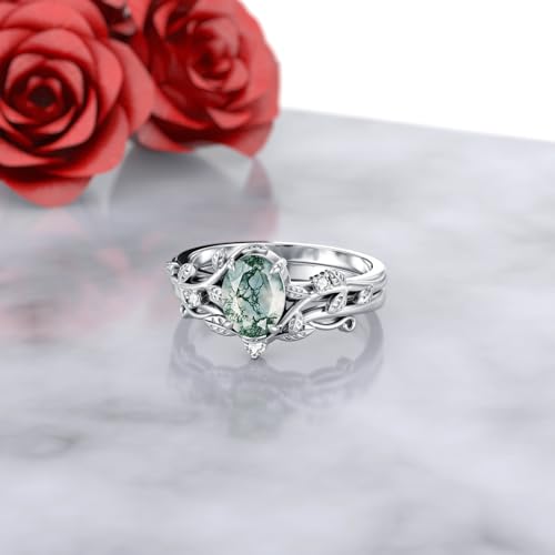Natural Moss Agate Ring for Women 925 Sterling Silver Pear/Oval/Kite Cut Green Leaf Moss Agate Engagement Ring Promise Bridal Ring Set Anniversary Birthday Jewelry Gift-OMN9