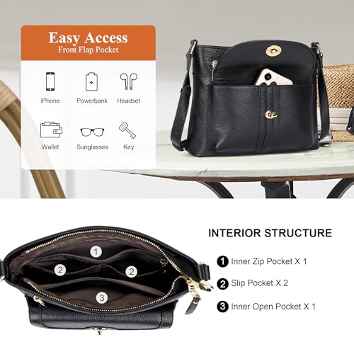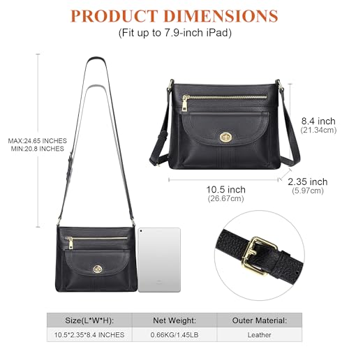 Fabric type: 90% Genuine LeatherOrigin: ImportedClosure type: ZipperLining: PolyesterPremium Material: This leather crossbody bag for women is made of pebbled leather and polyester lining, high quality golden hardware.Size and Weight: 10.5( L)x 2.35(W)x 8.4(H) inch. Shoulder drop: 20.8 to 24.65 inches. The weight of this leather purse is 0.66 kilograms/1.45 pounds.Structure: The women's crossbody leather bag has a lock button pocket on the front, 1 front zipper pocket, and 1 small zipper pocket on the back. Leather crossbody bag for women has 1 large compartment, 2 slip pocket 1 zipper pockets, and 1 open pocket.Practicality: Multi pocket messenger bag for women designed with soft leather, which is practical and fashionable. The number of pockets makes it easy to compartmentalize things you need to access quickly and readily without pulling everything out to get it.Fits Any Occasion: Great for everyday use or special events, this women's crossbody purse adds a touch of style to any outfit. Suitable for work, weekends, shopping, travel, or dating. Perfect for everyday use. High quality materials and excellent craftsmanship ensure long-lasting durability.