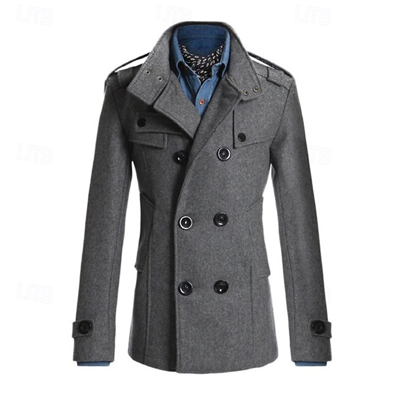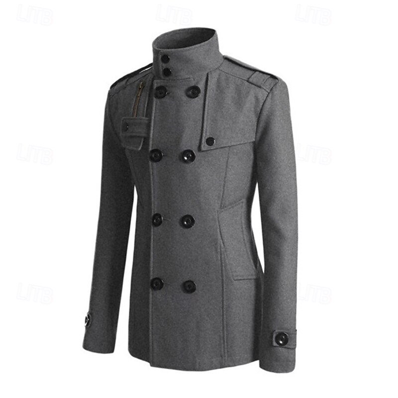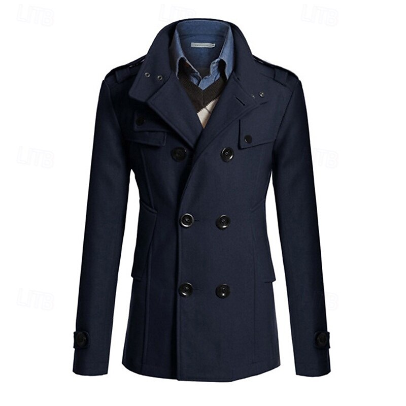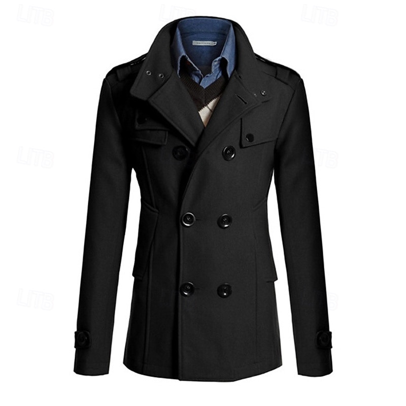 Men's Peacoat Trench Coat Daily Vacation Fall & Winter Polyester Thermal Warm Outerwear Clothing Apparel Fashion Classic Plain Pocket Stand Collar Double Breasted