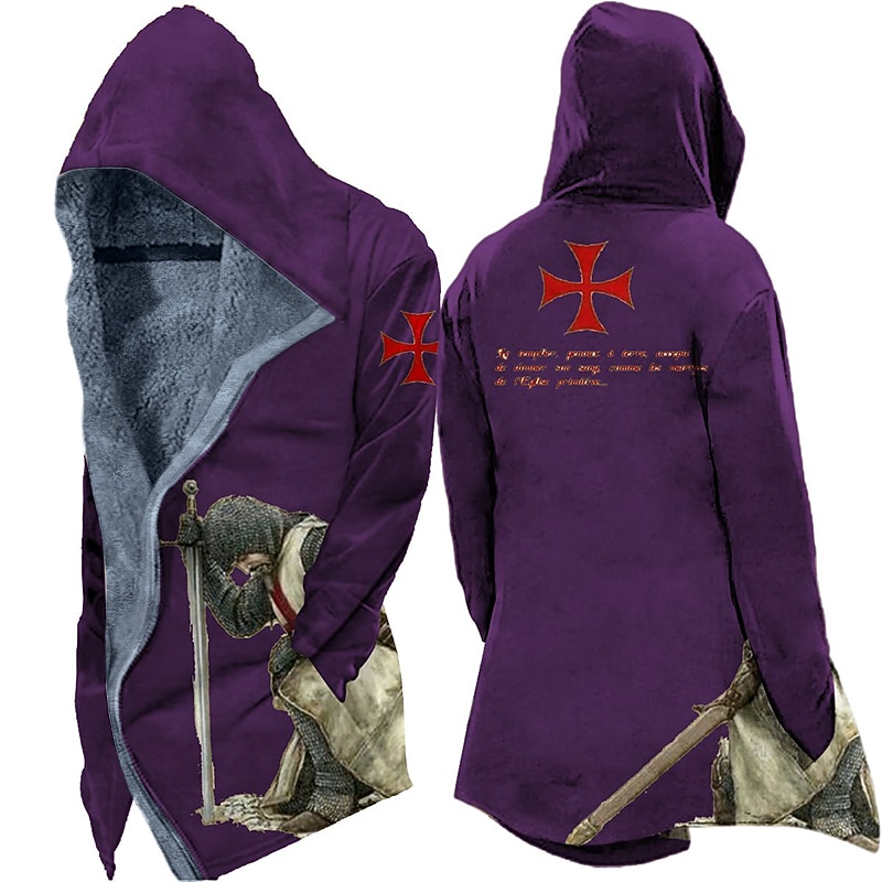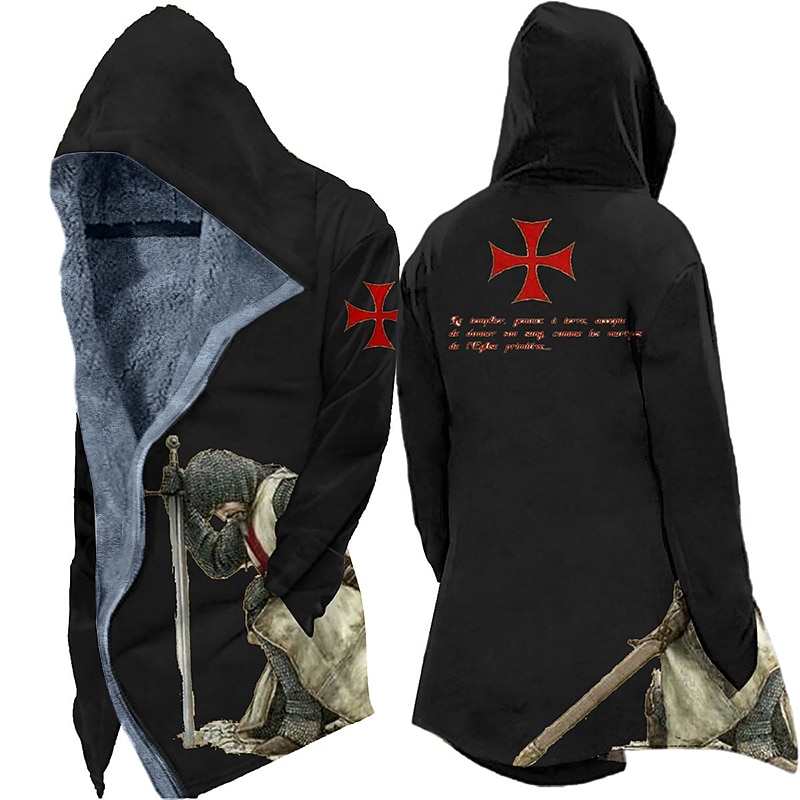 Highlights [Fabric] : Crafted from a durable polyester-blend, this men's winter hoodie ensures a robust yet soft exterior. The inner lining is made from plush fleece, providing warmth and comfort during fall and winter months. [Fit] : Designed with a relaxed fit, this hoodie offers casual style and comfort. Its regular length and hoodie neckline provide a comfortable and versatile look suitable for various occasions. [Design Highlights] : The hoodie features a unique medieval theme with a striking red Templar cross print on the back and sleeve, enhancing its historical appeal. The detailed illustration of a knight on the front adds an intriguing touch. It comes with a full-length zipper for convenience and an adjustable hood for additional protection against the elements. The practical front pockets offer added functionality and style. [Occasions] : Ideal for daily wear, vacations, going out, and weekend gatherings. This hoodie is perfect for those who appreciate vintage-inspired fashion and historical themes, providing both style and comfort for any relaxed occasion. [Size Range] : Available in sizes M, L, XL, 2XL, 3XL, and 4XL, catering to a wide range of body types. Choose your perfect fit for a flattering and comfortable feel.