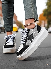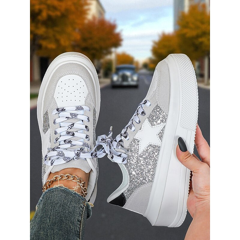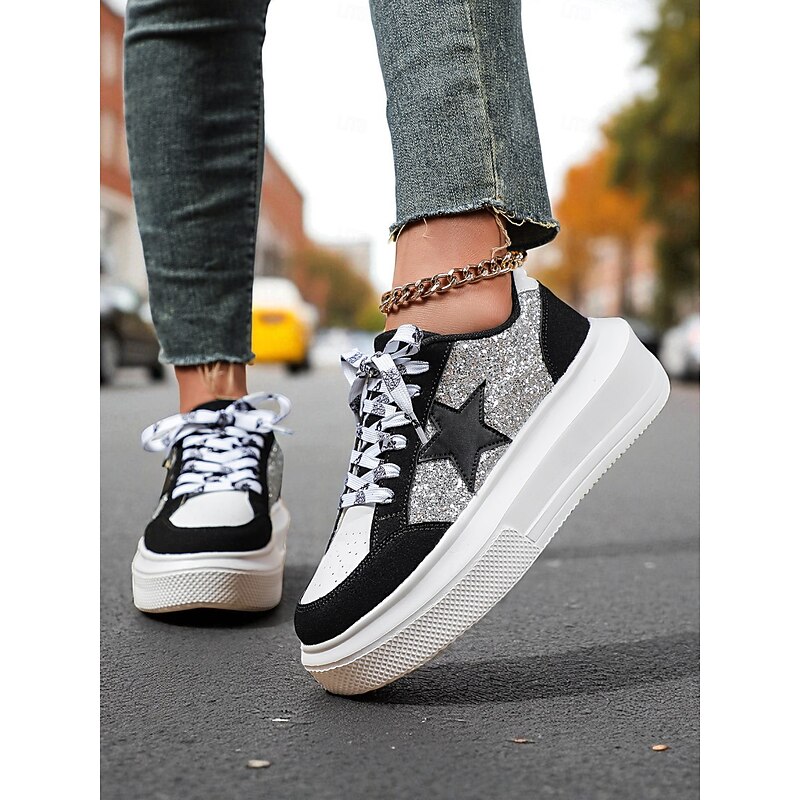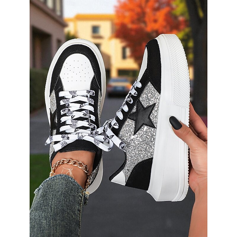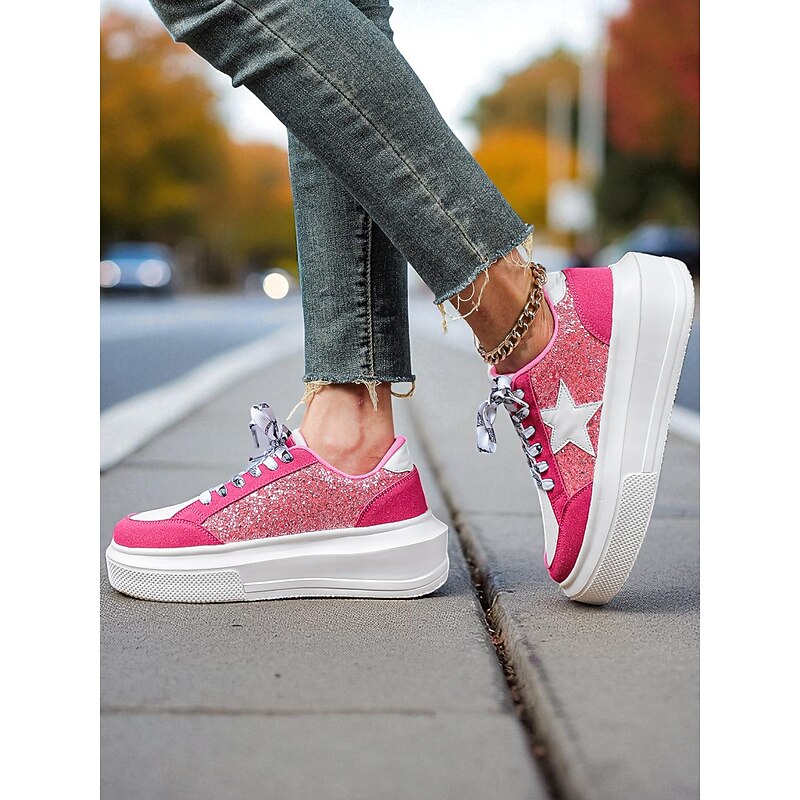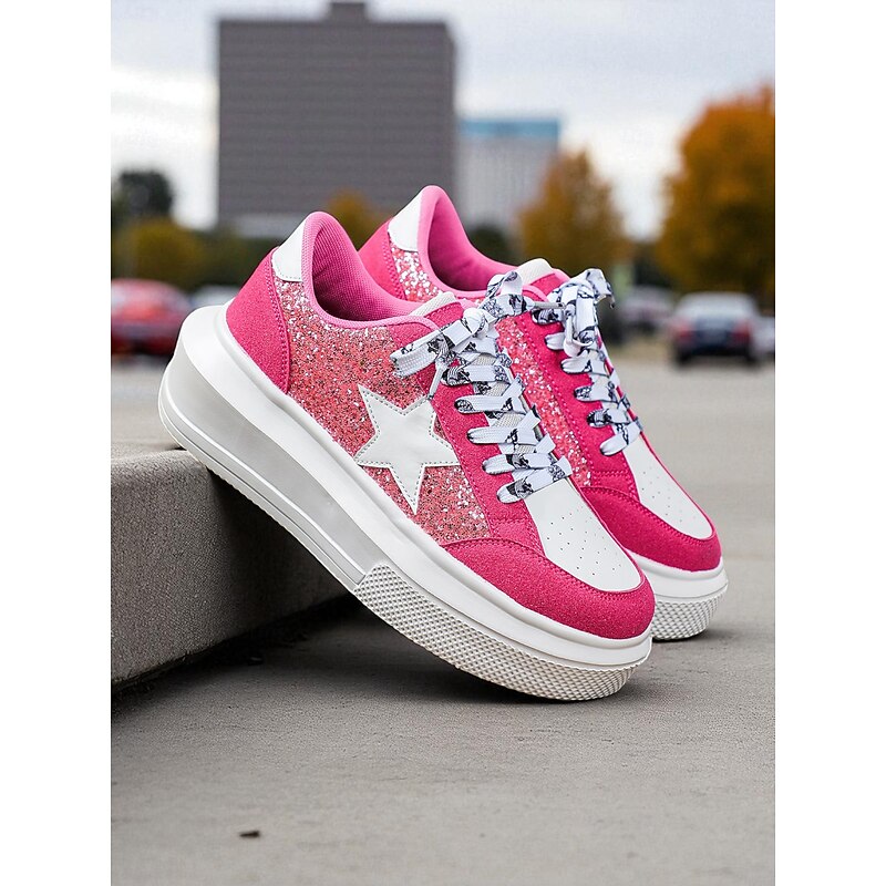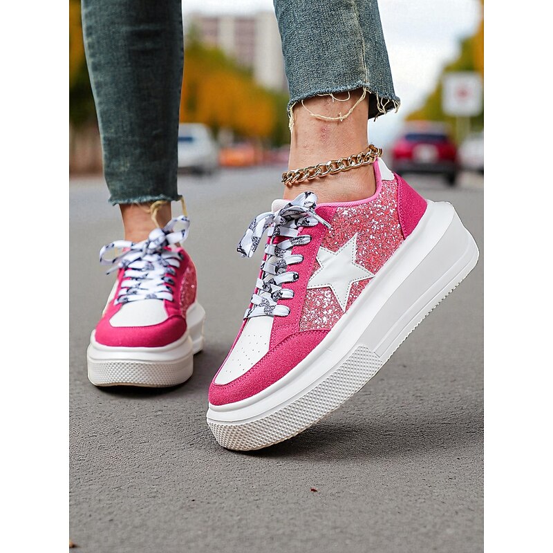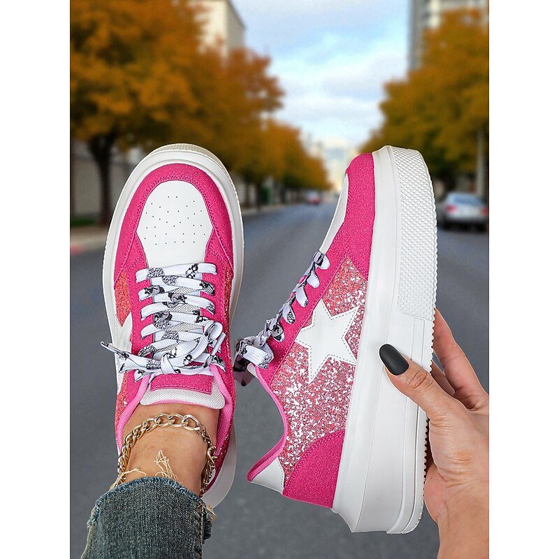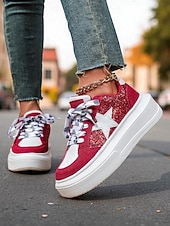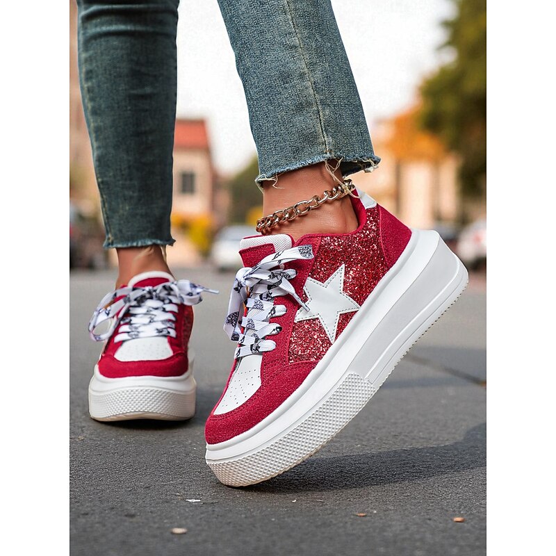 Why Choose Women's Glitter Star Platform Sneakers - Red and White Chunky Lace-Up Casual Shoes with Sparkly Sequin Detail for Street Style, Travel & Festivals?