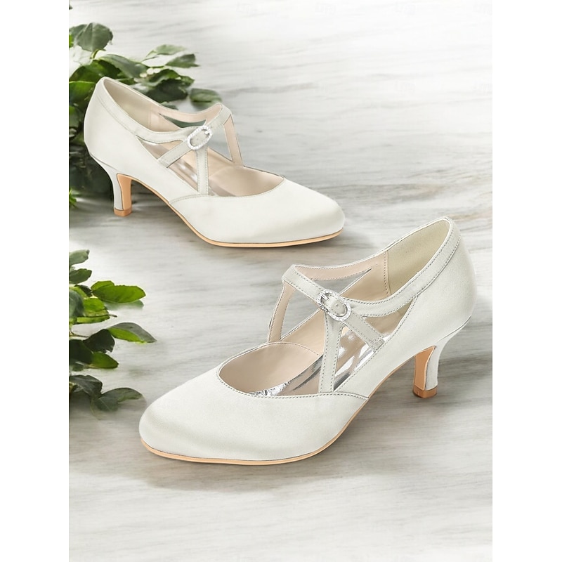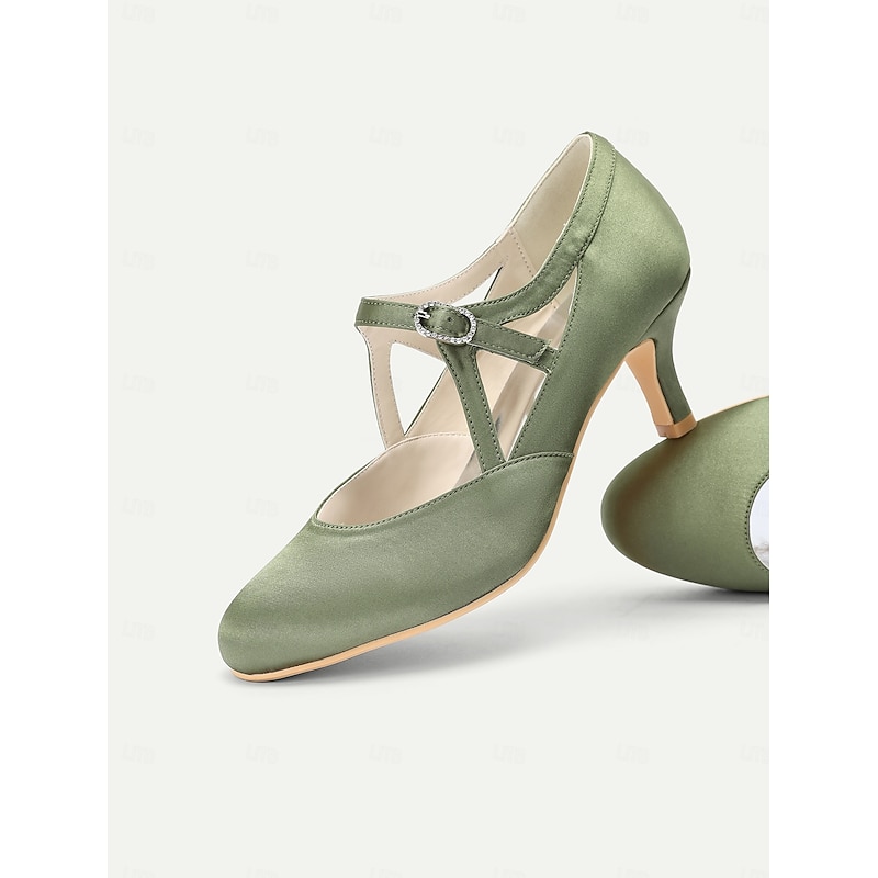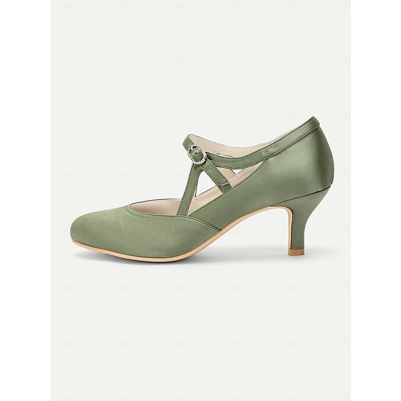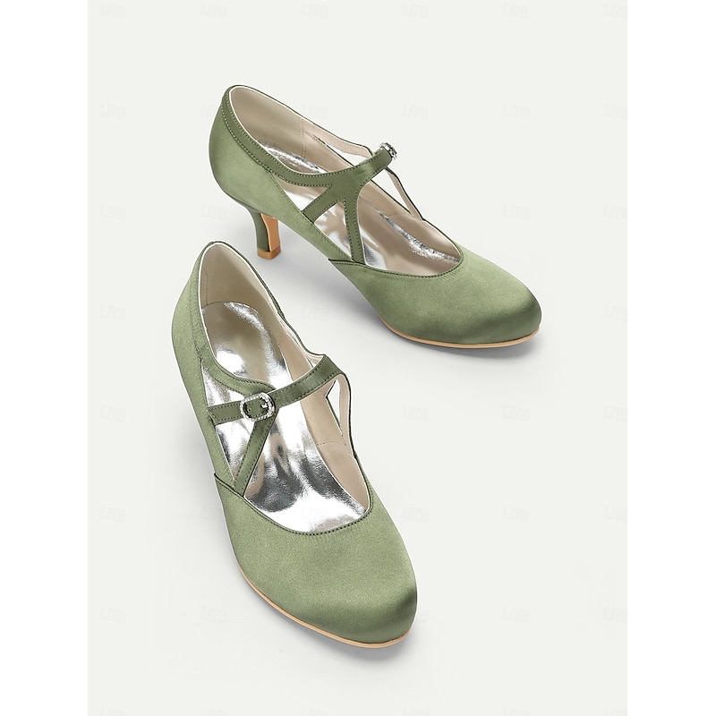 HOT ! Women's Sage Green Satin T-Strap Heels-Vintage Gatsby Mid Heel Pumps with Buckle Closure, Elegant Shoes for Weddings & Ballroom Dance