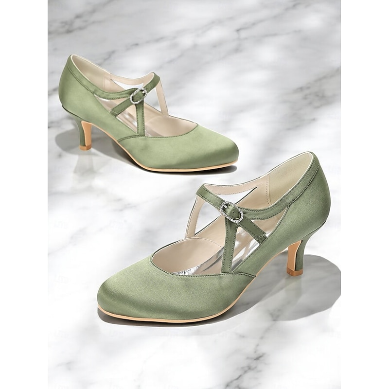 Women's Sage Green Satin T-Strap Heels-Vintage Gatsby Mid Heel Pumps with Buckle Closure, Elegant Shoes for Weddings & Ballroom Dance 1