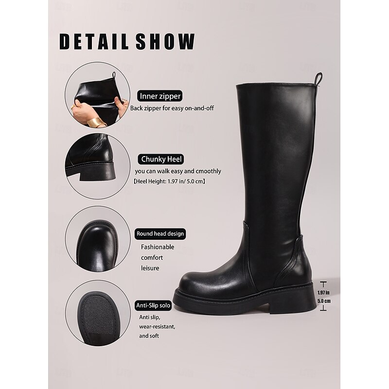 Highlights - Premium leather and faux leather upper materials for a stylish and luxurious look - Comfortable textile lining for all-day wear - Chunky heel for added stability and style - Classic round toe shape for a timeless appeal - Durable rubber outsole for long-lasting wear - Stay on-trend with the 2025 riding boots style.