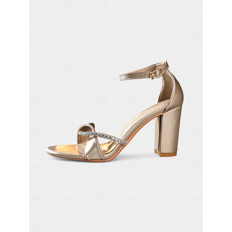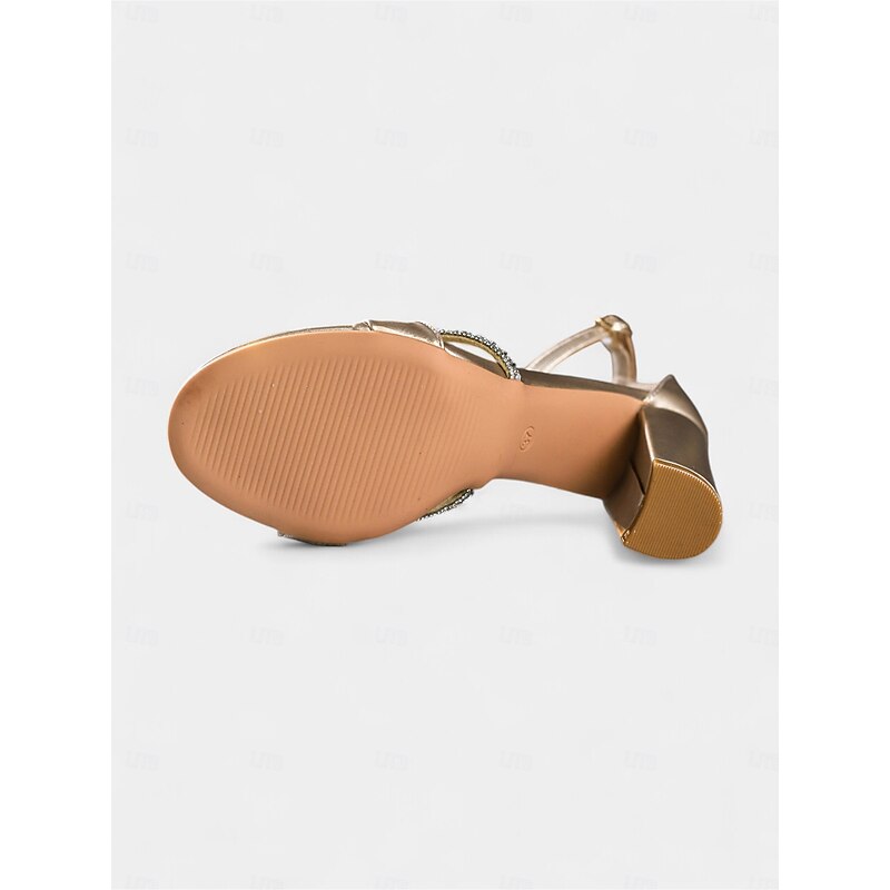 HOT ! Women's Gold PU Block Heel Sandals - Ankle Strap Open-Toe Party Heels with Rhinestone Trim for Cocktail Events and Semi-Formal Occasions