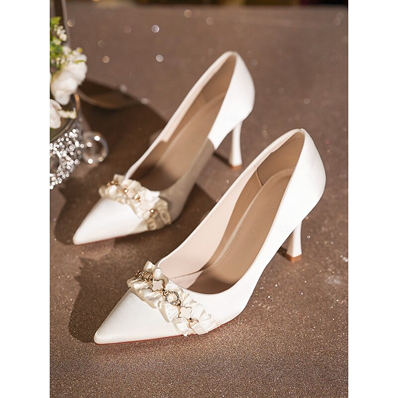 Why Choose Women's White Satin Pointed Toe High Heel Pumps with Ruffle and Crystal Chain Embellishment - Elegant Bridal Shoes for Wedding and Formal Occasions?