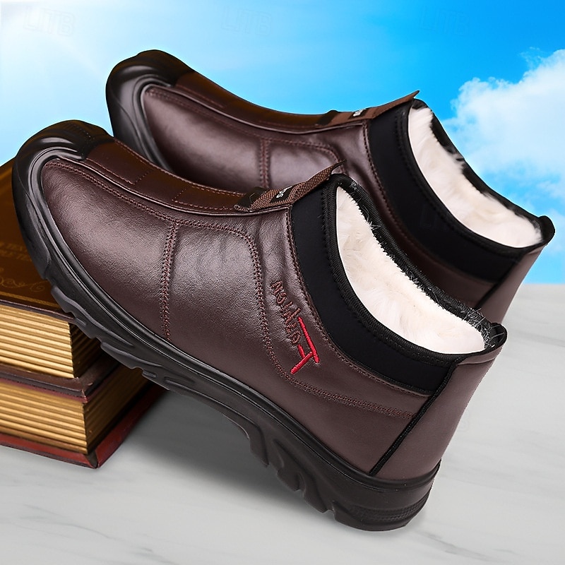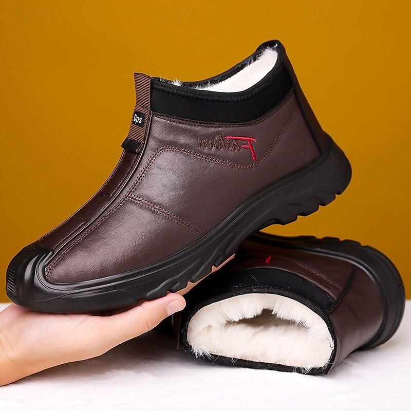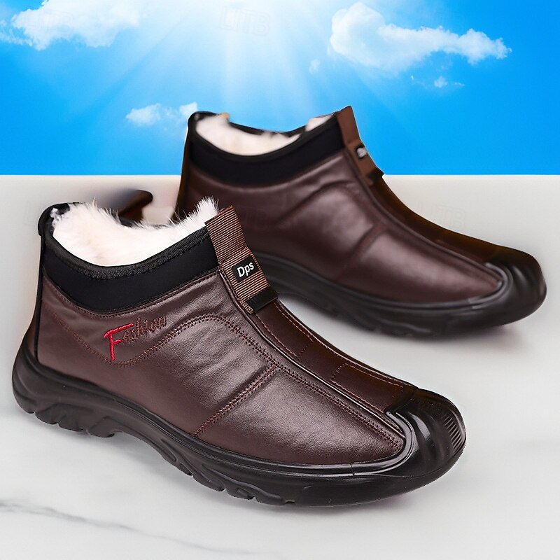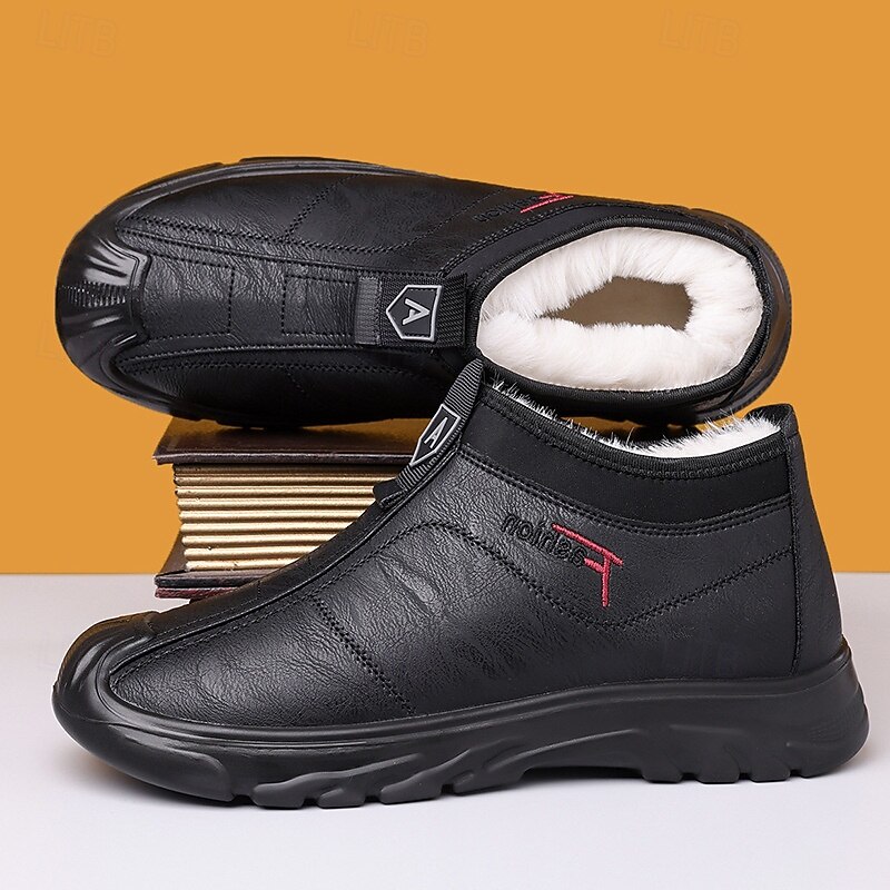 Highlights [Fabric] : Crafted from high-quality PU leather, these men's boots offer a stylish and durable exterior suitable for winter conditions. The material is designed to be both weather-resistant and robust, ensuring your feet remain dry and protected during cold, wet days. [Fit] : With a practical slip-on design and classic round toe shape, these boots provide easy wearability and a comfortable fit, perfect for everyday use. The plush fleece lining inside offers excellent warmth and insulation, making them an ideal option for colder climates. [Design Highlights] : These boots feature a convenient front pull tab for effortless wearing and removal. The rugged non-slip rubber outsole enhances grip and traction, ensuring stability on various surfaces. The sleek black color and stitched detailing add a touch of sophistication to this functional design. [Occasions] : Perfectly suited for winter weather and outdoor activities, these boots are versatile enough for casual outings, daily wear, or adventurous weekends. Whether you are navigating snowy streets or enjoying a winter hike, these boots deliver both style and functionality. [Size Range] : Available in sizes ranging from US7 / EU39 / UK6 to US11 / EU44 / UK10, these boots accommodate a broad range of foot sizes, ensuring a suitable fit for different preferences and needs.