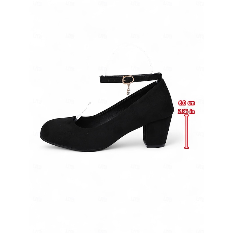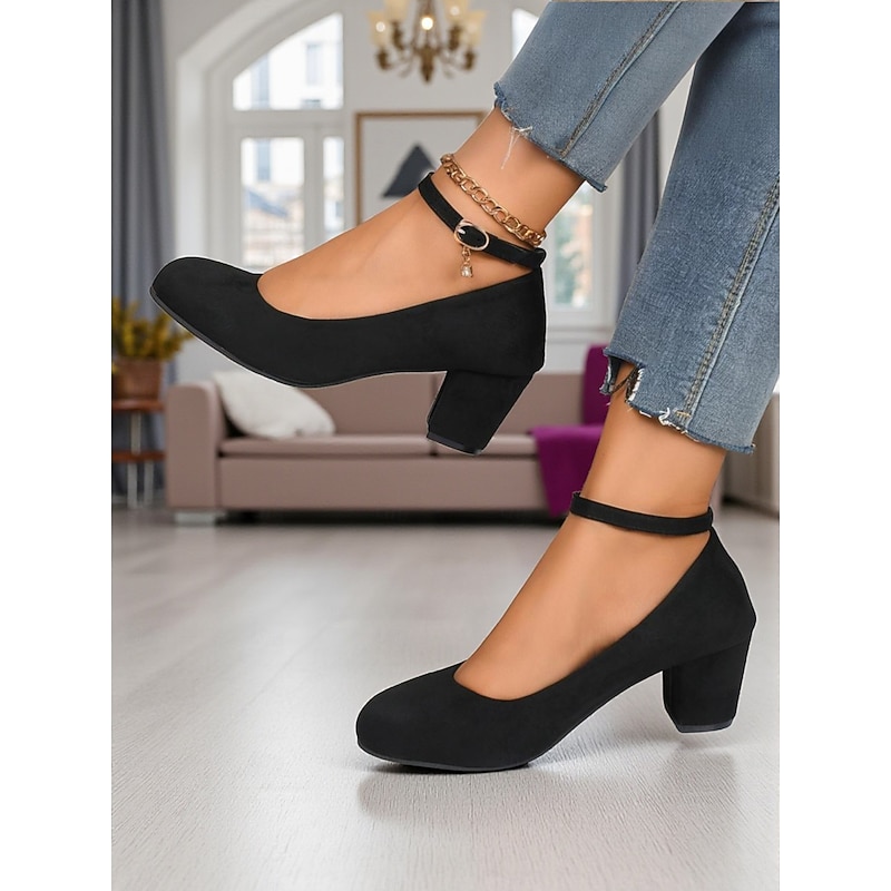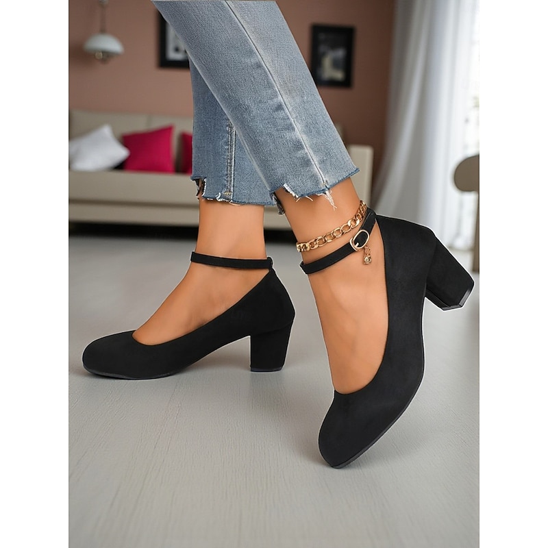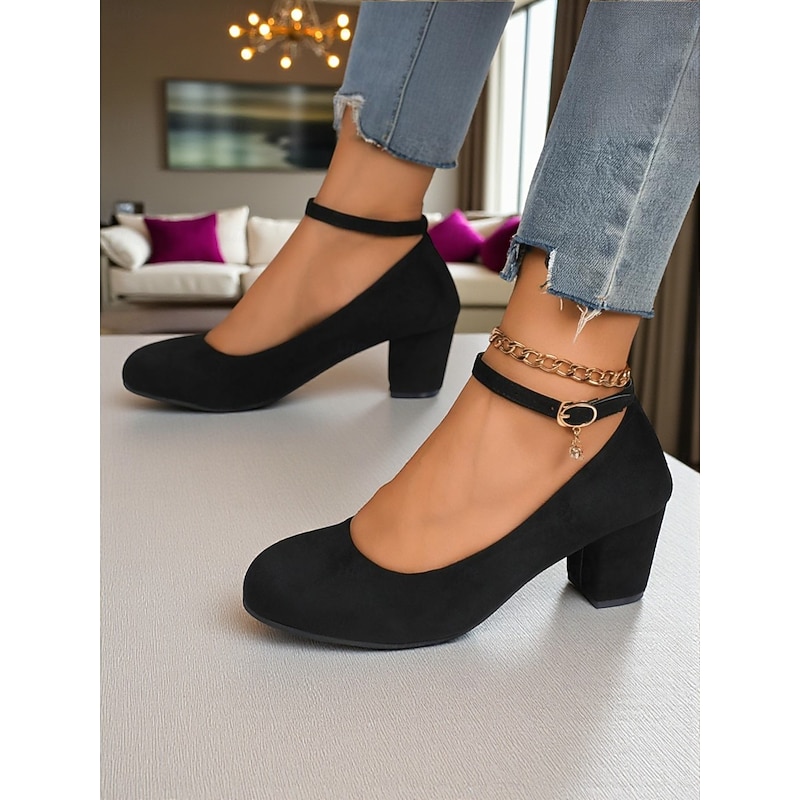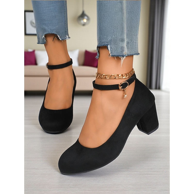 Highlights - Luxurious faux suede upper material - Smooth and sleek synthetic leather lining - Stylish buckle embellishment - Comfortable chunky heel for all-day wear - Classic round toe shape - Durable rubber outsole for long-lasting use