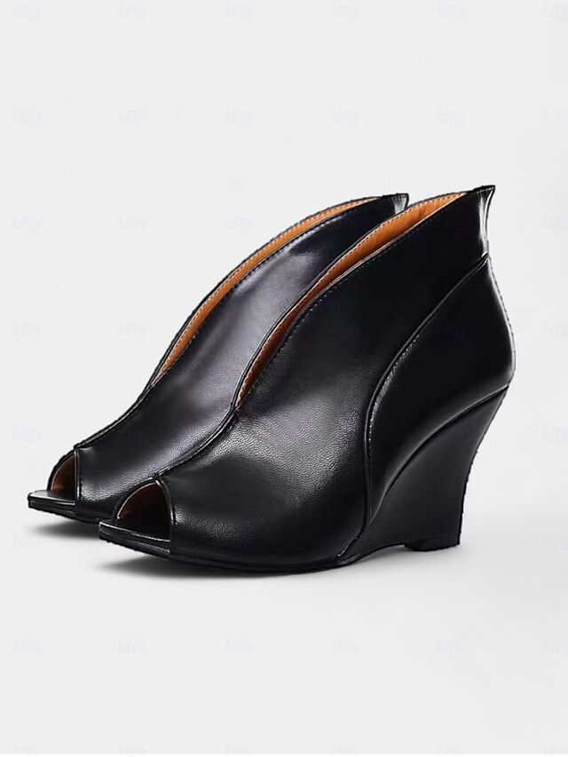 Highlights [Fabric] Crafted from smooth, high-quality PU material, these women's wedge booties boast a polished look that mimics genuine leather, providing both sophistication and durability. [Silhouette] Featuring a stylish peep-toe design, these booties are complemented by a sculptural wedge heel that ensures stability and a modern edge, perfect for a variety of occasions. [Design Highlights] The minimalist yet bold design of these ankle booties includes a unique open-toe feature that enhances breathability, while the loafer-style closure offers a snug, customizable fit. The booties are available in classic colors like black, white, and blue, allowing for versatile styling options. [Occasions] Designed for daily wear, these booties transition seamlessly from casual outings to dressier events. Whether paired with jeans for a laid-back look or dressed up with a formal dress, these shoes add a touch of elegance and style to any ensemble. [Size Range] These booties are available in a range of sizes, from US5.5 to US10.5, ensuring a suitable fit for a variety of foot sizes. Standard sizing is recommended; select your usual size for the best fit. Perfect for everyday use. High quality materials and excellent craftsmanship ensure long-lasting durability.