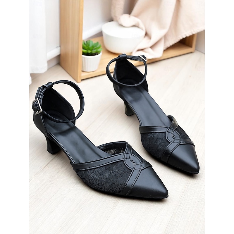 Highlights - Elegant lace and sophisticated faux leather upper materials - Stylish chunky heel for added comfort and support - Chic pointed toe shape for a modern look - Durable rubber outsole for long-lasting wear