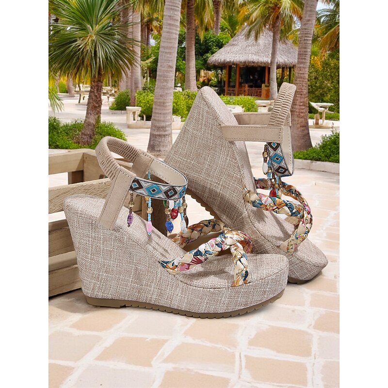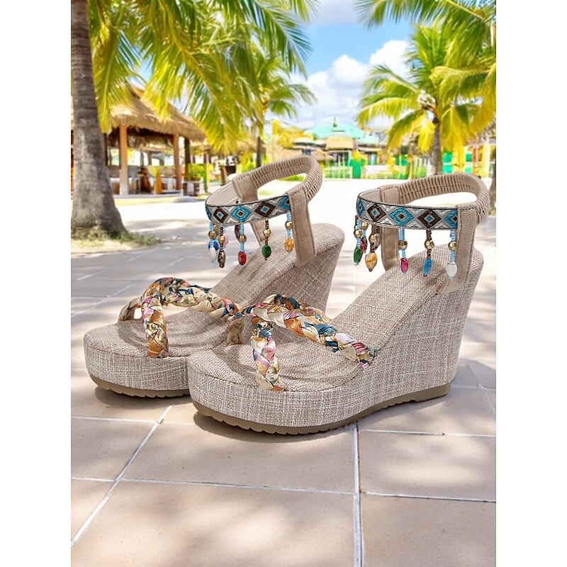 HOT ! Women's Boho Beaded Wedge Sandals – Braided Platform Shoes with Tribal Ankle Straps for Beach, Festivals & Vacations