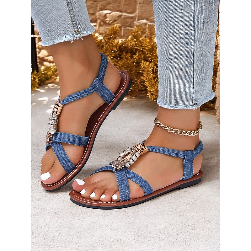 HOT ! Women's Black Bohemian Sandals with Beaded Embellishments, Cross Straps and Flat Sole for Summer Beachwear and Casual Outings