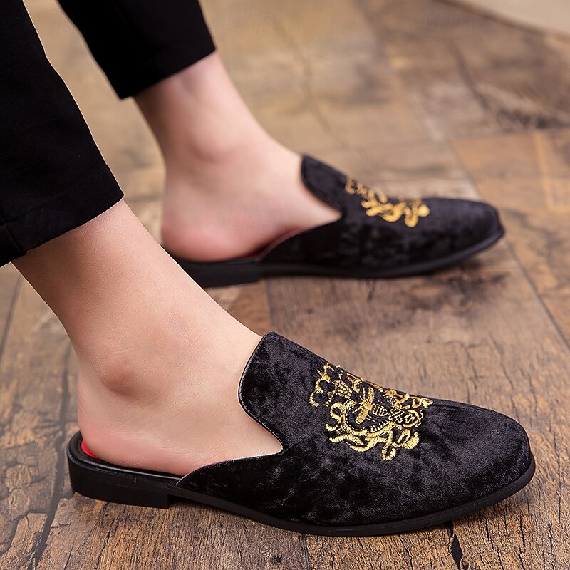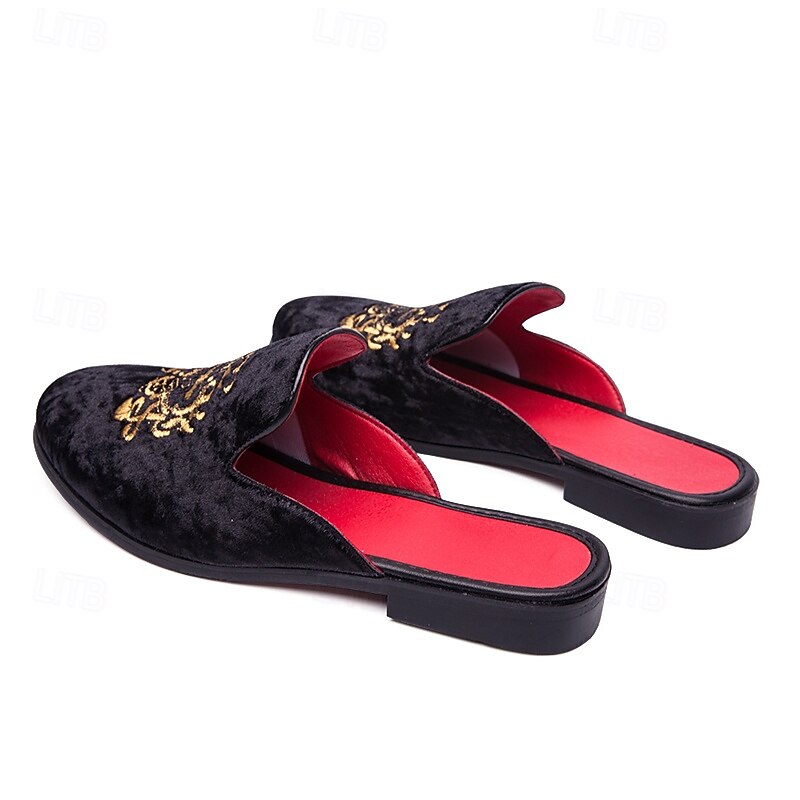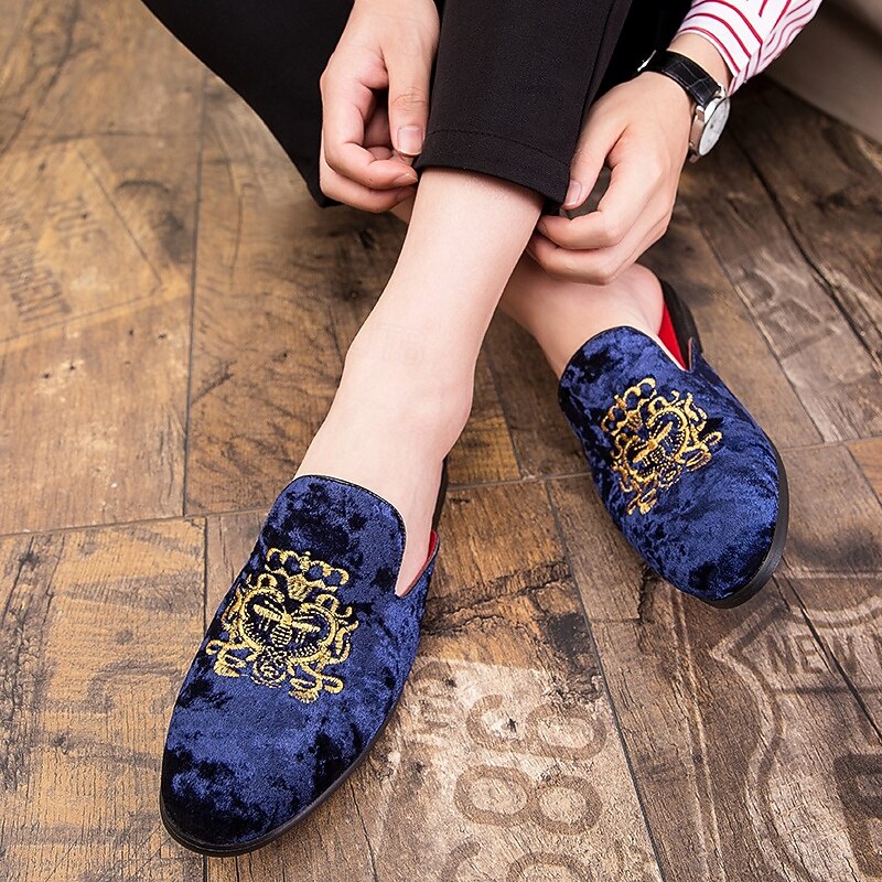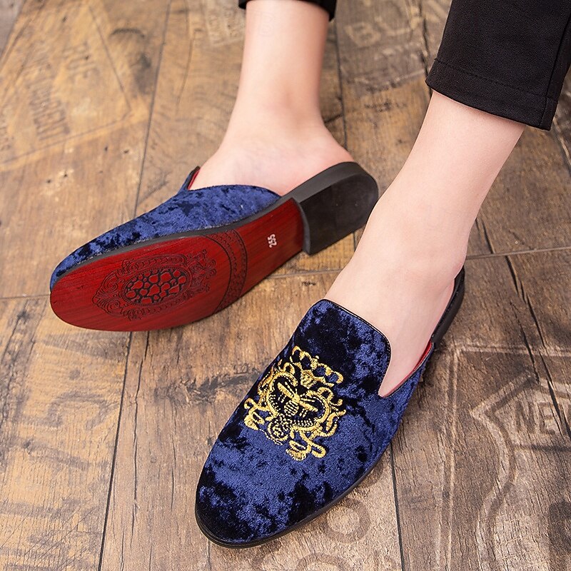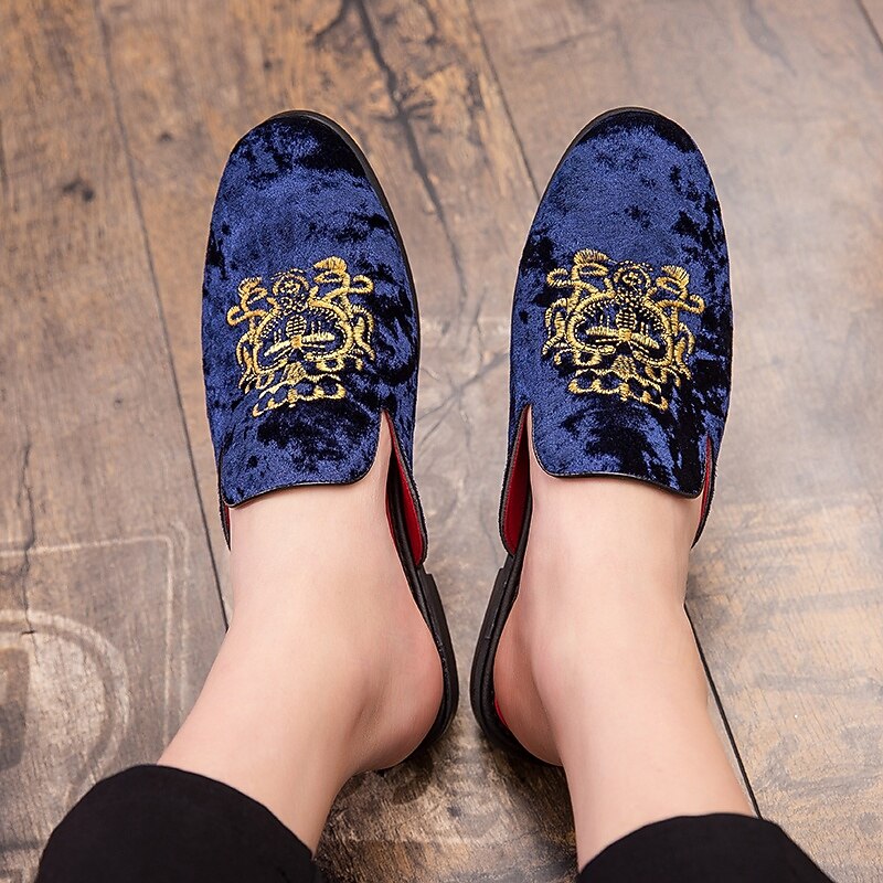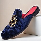 Highlights [Fabric] : Crafted from luxurious velvet, these men's loafers offer a plush and sophisticated texture. The velvet material not only enhances the elegance of the slippers but also ensures a comfortable wear experience. [Fit] : Designed in a classic slip-on loafer style, these shoes offer a timeless and convenient fit. The round toe shape provides ample space, ensuring comfort and ease, perfect for casual elegance. [Design Highlights] : The design is accentuated by an intricate gold crown crest embroidery, which adds a regal touch of opulence. The striking red lining creates a vibrant contrast against the deep navy or black exterior, while the black rubber outsole ensures durability and slip resistance. [Occasions] : These loafers are ideal for a range of occasions, from relaxing at home to stylishly hosting guests. Perfect for adding a touch of luxury to indoor settings, they provide both comfort and a sophisticated statement. [Size Range] : Available in a range of sizes from US6 to US10, these loafers cater to a variety of foot sizes, ensuring a perfect fit for casual and stylish wear.