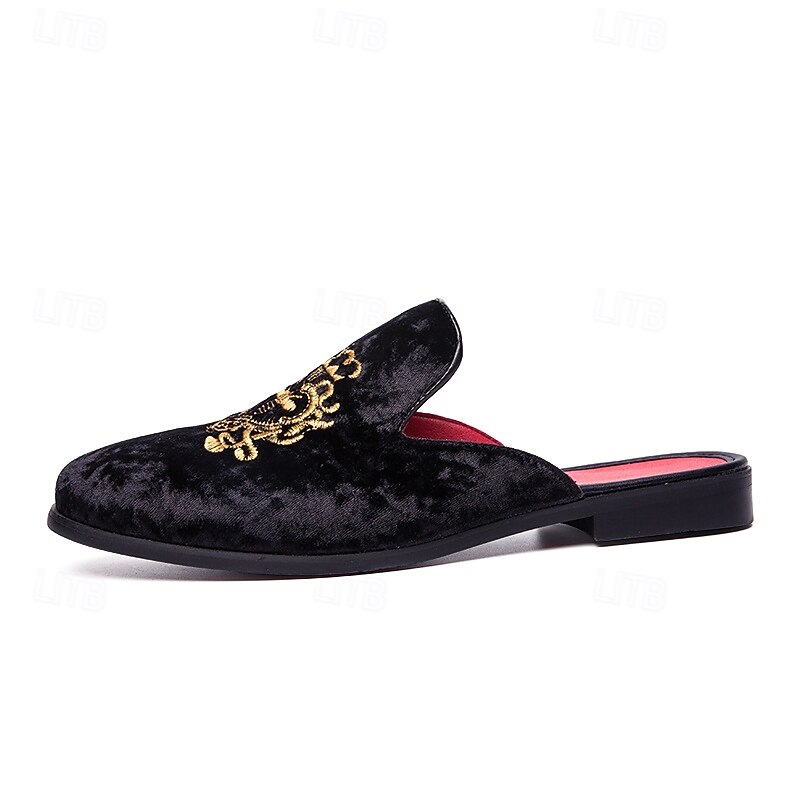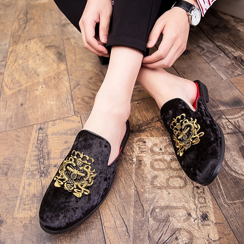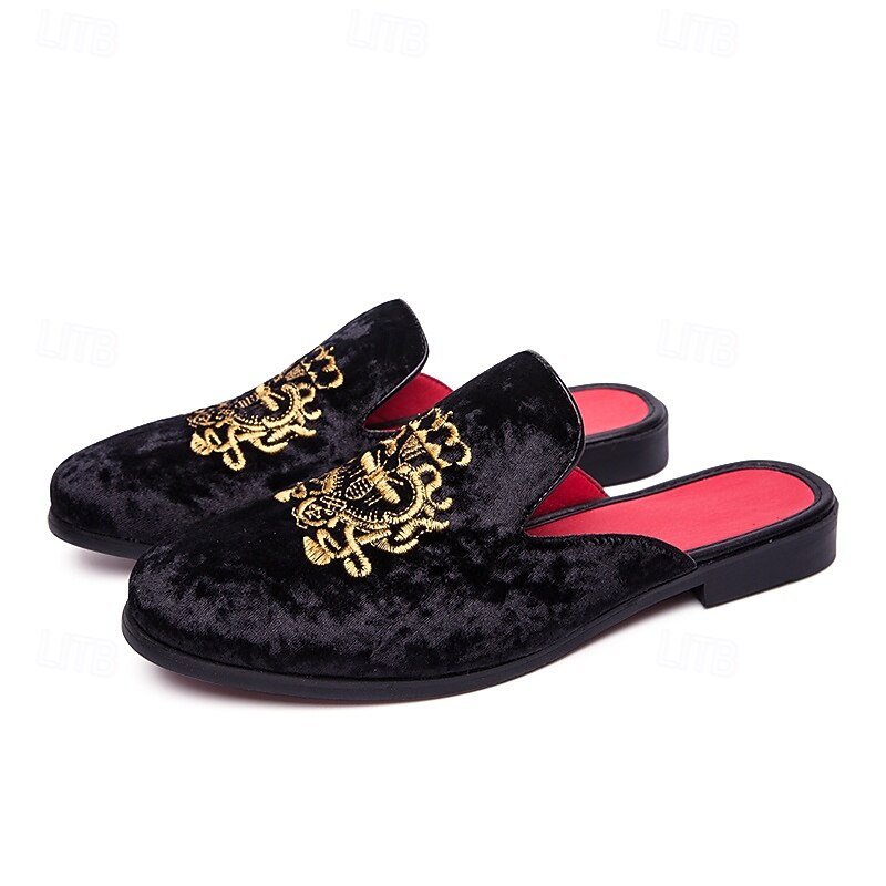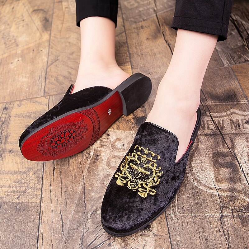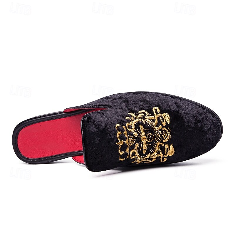 Highlights [Fabric] : Crafted from luxurious velvet, these men's loafers offer a plush and sophisticated texture. The velvet material not only enhances the elegance of the slippers but also ensures a comfortable wear experience. [Fit] : Designed in a classic slip-on loafer style, these shoes offer a timeless and convenient fit. The round toe shape provides ample space, ensuring comfort and ease, perfect for casual elegance. [Design Highlights] : The design is accentuated by an intricate gold crown crest embroidery, which adds a regal touch of opulence. The striking red lining creates a vibrant contrast against the deep navy or black exterior, while the black rubber outsole ensures durability and slip resistance. [Occasions] : These loafers are ideal for a range of occasions, from relaxing at home to stylishly hosting guests. Perfect for adding a touch of luxury to indoor settings, they provide both comfort and a sophisticated statement. [Size Range] : Available in a range of sizes from US6 to US10, these loafers cater to a variety of foot sizes, ensuring a perfect fit for casual and stylish wear.