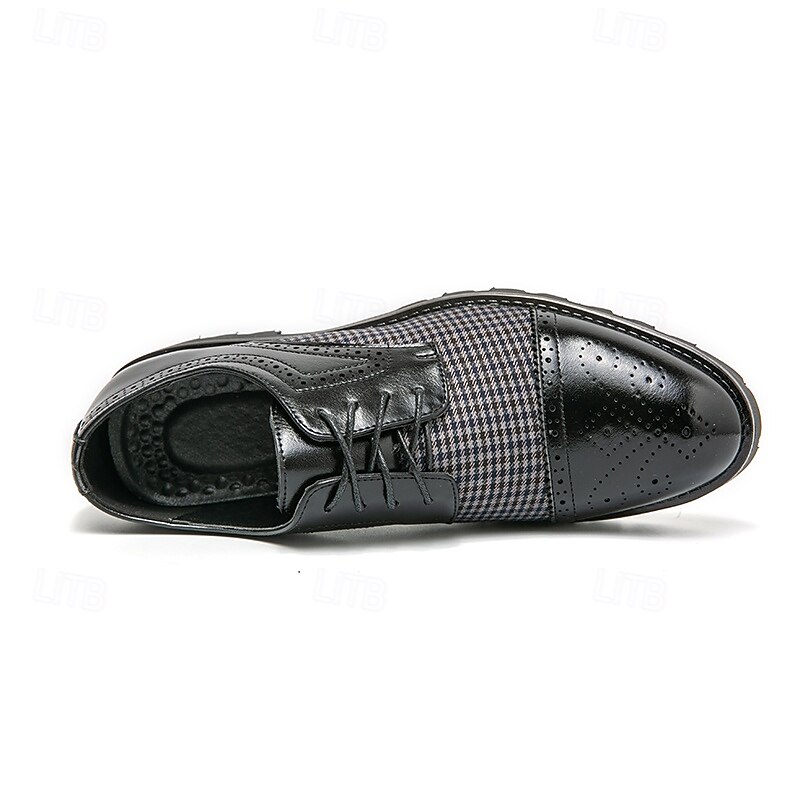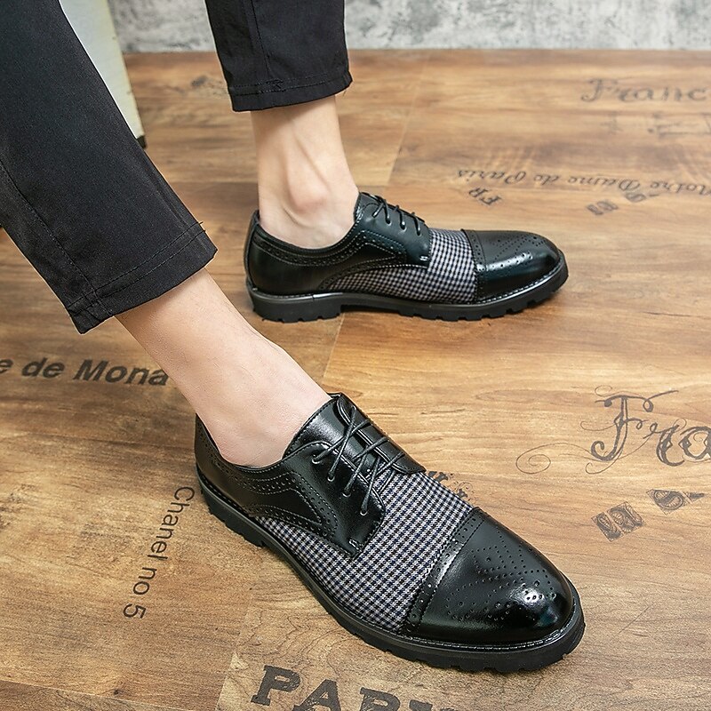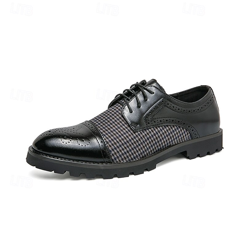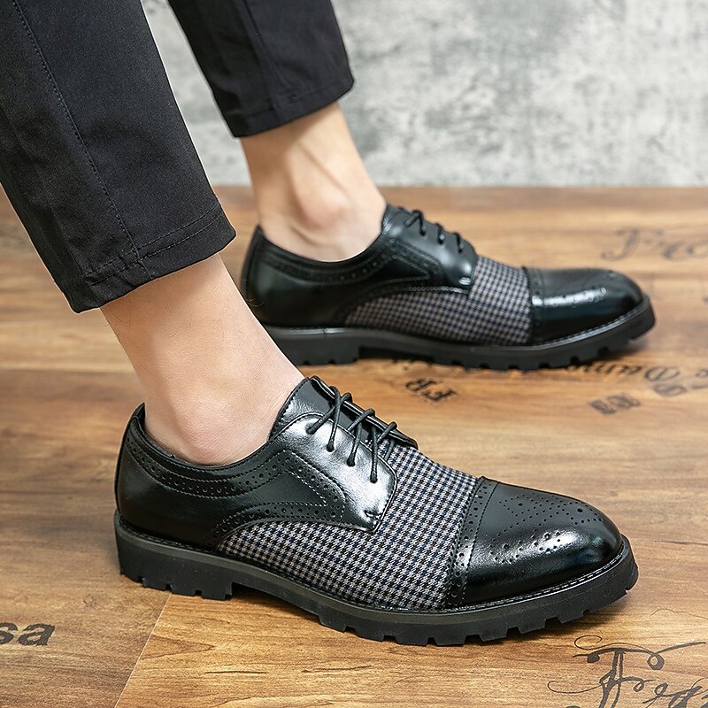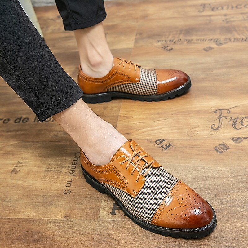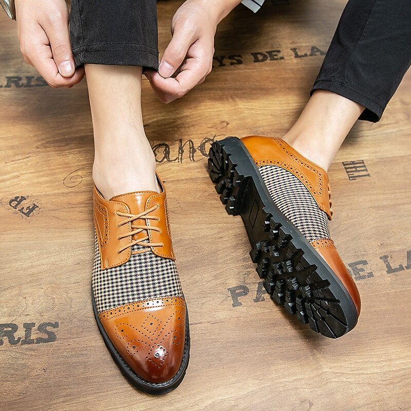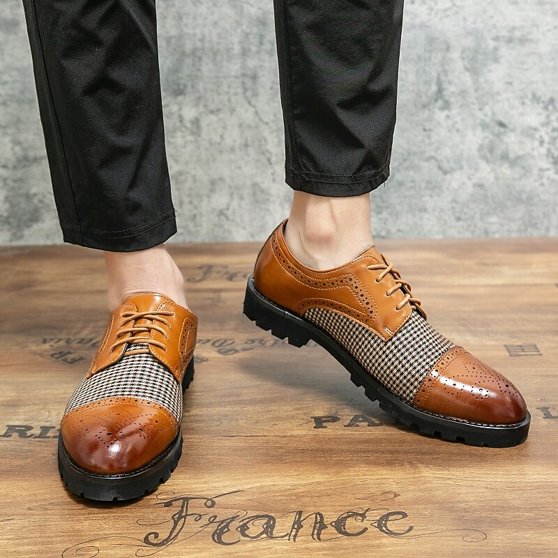 Highlights [Fabric & Material] Crafted using a sophisticated combination of microfiber and a unique houndstooth-patterned fabric, these Men's Houndstooth Oxford Shoes provide an exquisite touch of style. Lined with high-quality PU materials, they offer comfort and breathability, perfect for fall and winter seasons. [Style & Fit] Designed in the timeless oxford style, these shoes feature a classic round toe and a secure lace-up closure. They boast a snug fit that is both comfortable and supportive, whether you're dressing for a formal occasion or a casual outing. [Design Highlights] The shoes showcase a harmonious blend of polished brown faux leather and intricate brogue detailing, giving them an elegant and distinguished look. The sturdy rubber sole enhances grip and ensures slip resistance, embodying durability and practicality. [Occasions] These versatile shoes are ideal for various settings, from formal events to casual gatherings. Whether you're at a weekend get-together or attending a business meeting, they effortlessly elevate your style with their classic yet modern appeal. [Size Range] Available in a range of sizes to cater to different preferences; US sizes range from 7 to 11, ensuring a perfect fit for every gentleman’s wardrobe.
