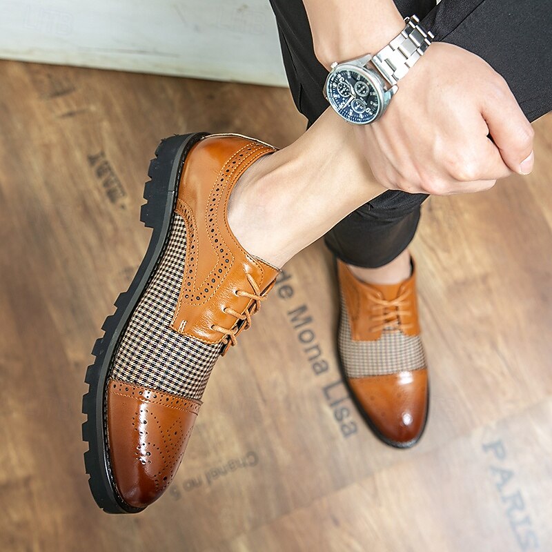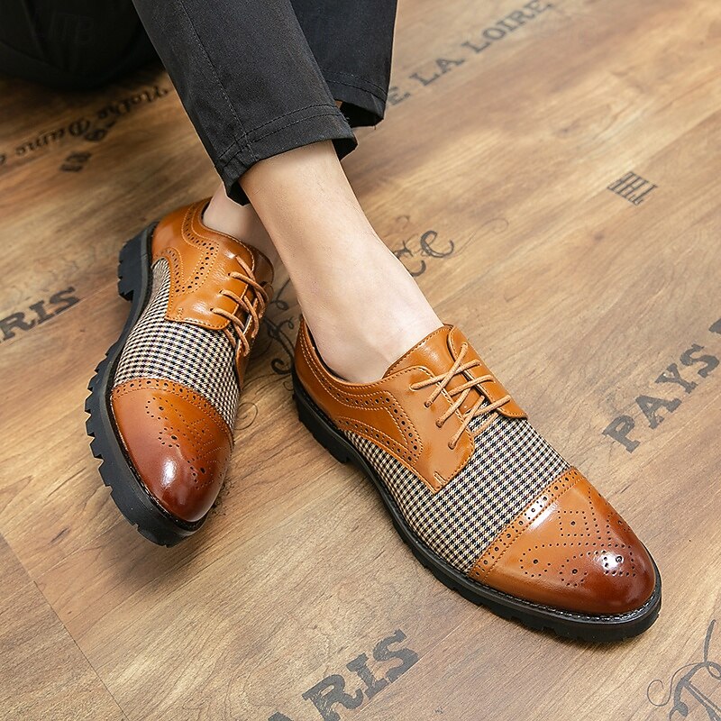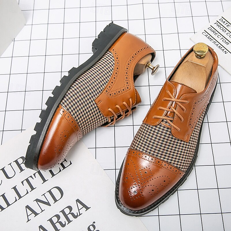 HOT ! Men's Houndstooth Oxford Shoes - Brown Faux Leather Lace-Up with Brogue Detailing and Rugged Sole for Casual and Formal Wear