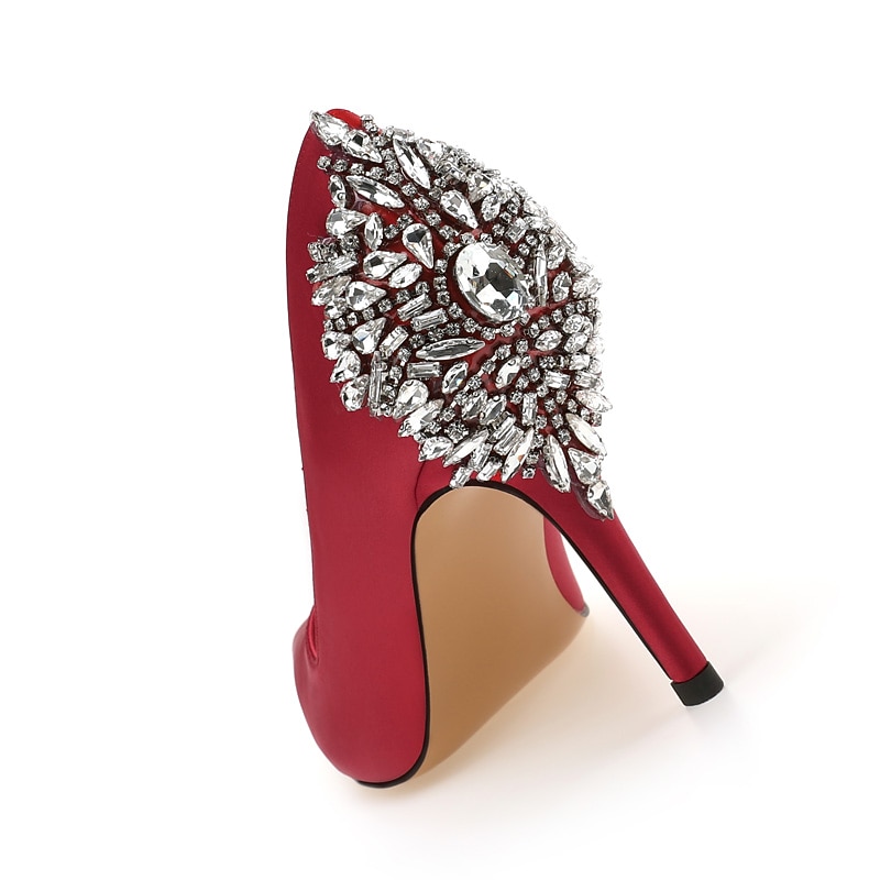 Highlights [Fabric] : Expertly crafted from a luxurious satin material that provides a silky sheen, these women's high-heeled shoes offer an elegant and sophisticated look, perfect for formal settings and evening occasions. The material not only adds a touch of class but also ensures comfort and durability. [Style] : Featuring a classic pointed toe design, these shoes have a timeless silhouette suitable for a range of occasions. The sleek stiletto heel seamlessly integrates height with elegance, making these shoes a perfect blend of classic and contemporary styles. [Design Highlights] : The standout feature of these bridal shoes is the exquisite crystal embellishment on the heel. Intricately arranged imitation rhinestones add a sparkling effect, offering a touch of glamour with every step, while maintaining a subtle yet sophisticated appearance. [Occasions] : Ideal for weddings, parties, office settings, and other special events, these shoes add a refined touch to any outfit. Whether you're attending a wedding as a bride or bridesmaid, or heading to an elegant office gathering, these pumps are designed to complement your style effortlessly. [Size Range] : Available in a wide range of sizes from 36 to 43, these shoes cater to various foot sizes, ensuring a comfortable and tailored fit for every occasion.