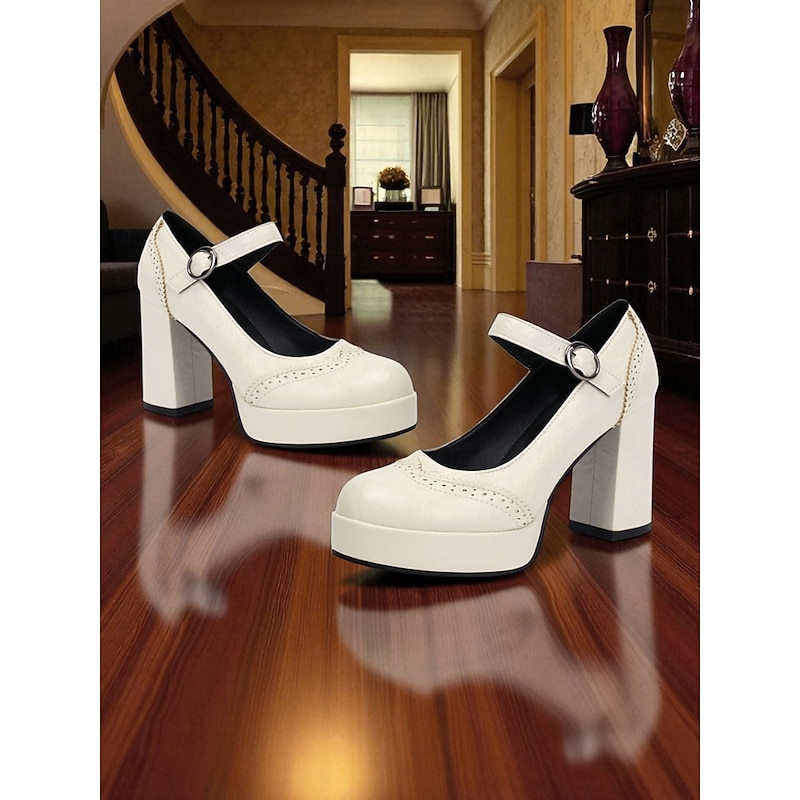 Women's Apricot Mary Jane Platform Pumps - 1950s Retro Chunky Heel Shoes with Brogue Detailing and Adjustable Strap for Office, Tea Parties, and Daily Wear 12