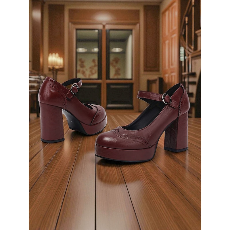 More information about Women's Apricot Mary Jane Platform Pumps - 1950s Retro Chunky Heel Shoes with Brogue Detailing and Adjustable Strap for Office, Tea Parties, and Daily Wear
