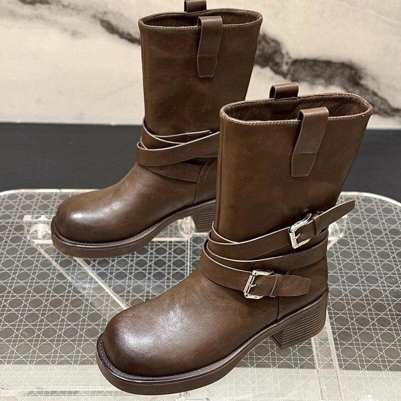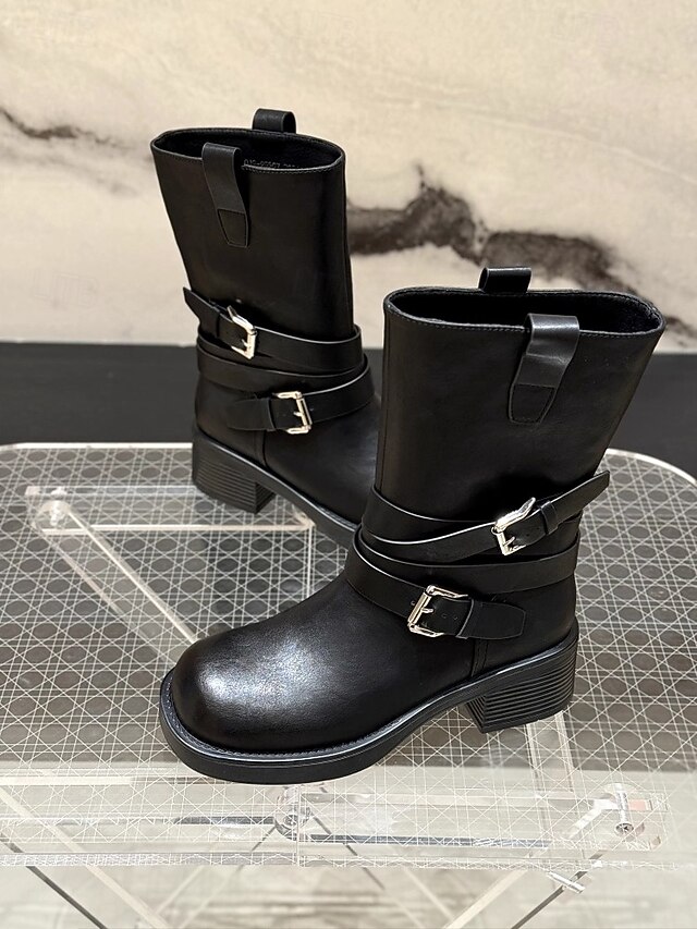 HOT ! Black Faux Leather Ankle Boots for Women – Buckle Strap Detail, Chunky Block Heels, Stylish and Durable Footwear