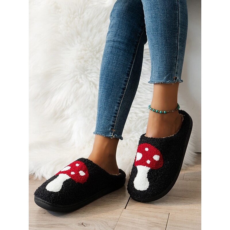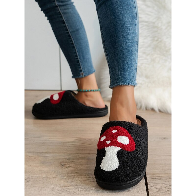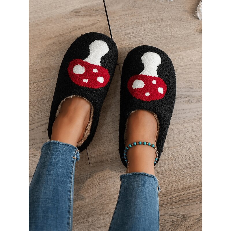 Women's Cozy Black Indoor Slippers with Red Mushroom Embroidery - Plush Lining, Non-Slip Sole, Perfect for Winter Home Relaxation