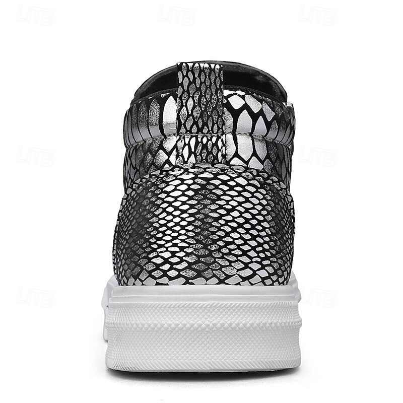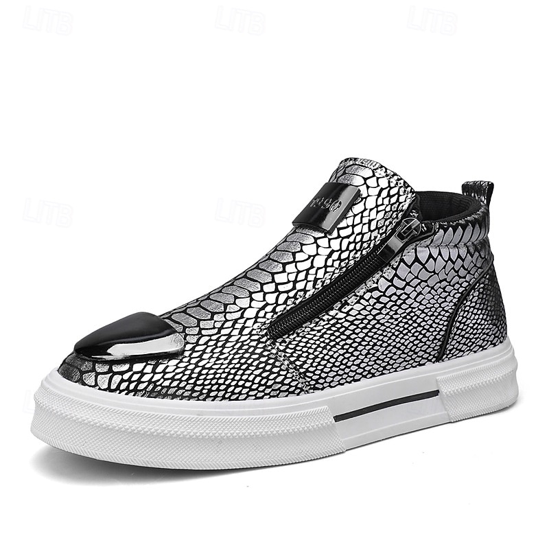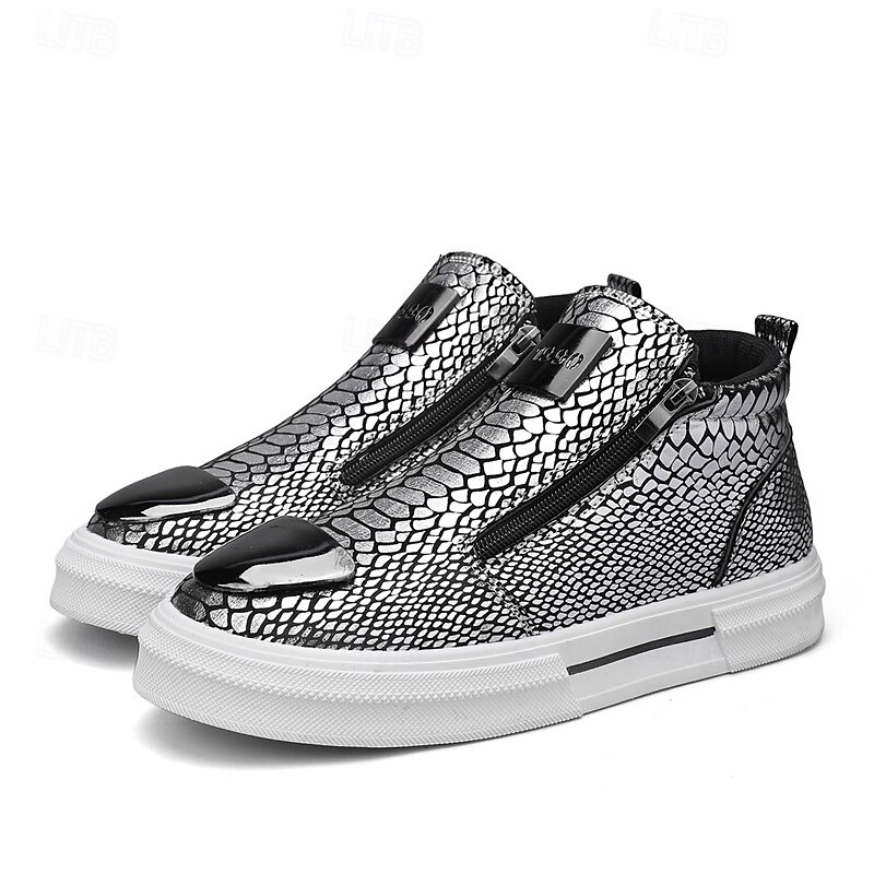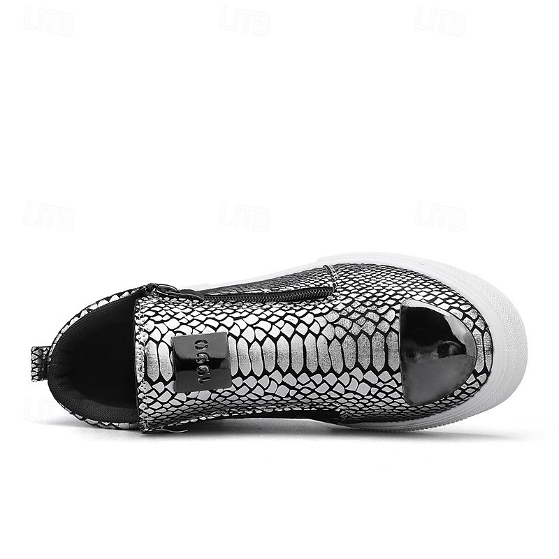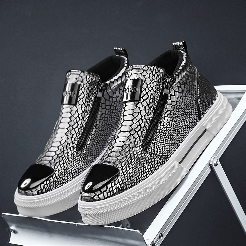 Men's Bronze Snakeskin Pattern Slip-On Sneakers with Side Zipper, Fashion Metallic Street Shoes for Club, Party and Urban Casual Wear 23