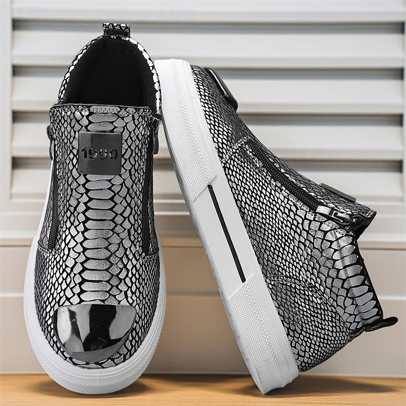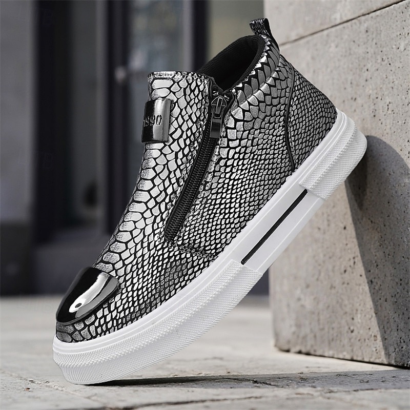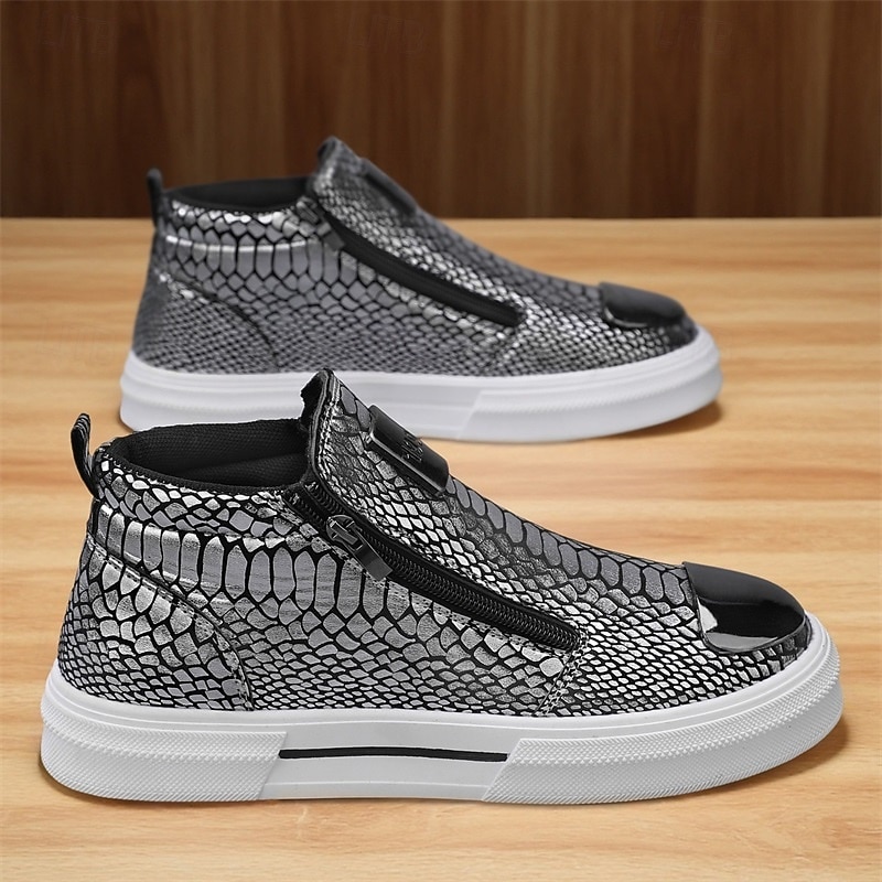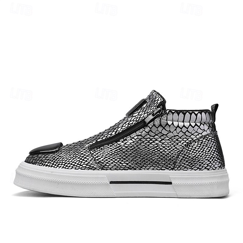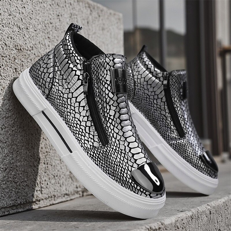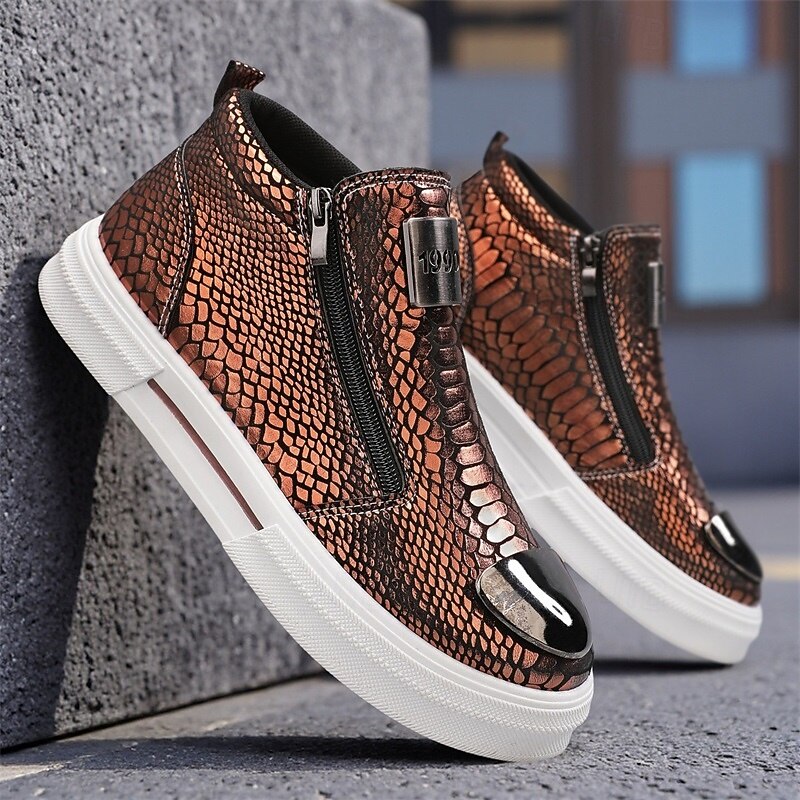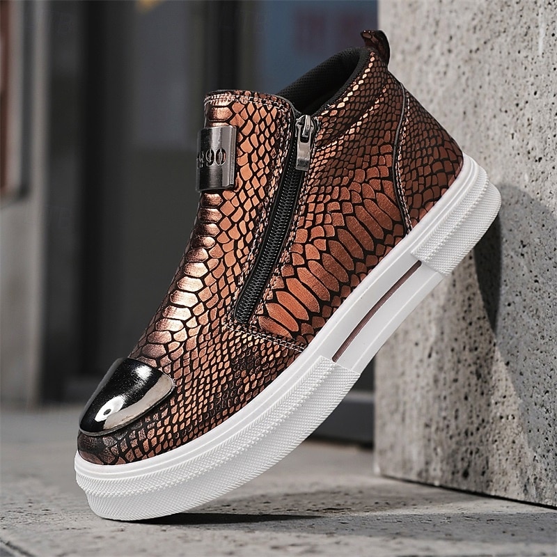 HOT ! Men's Bronze Snakeskin Pattern Slip-On Sneakers with Side Zipper, Fashion Metallic Street Shoes for Club, Party and Urban Casual Wear