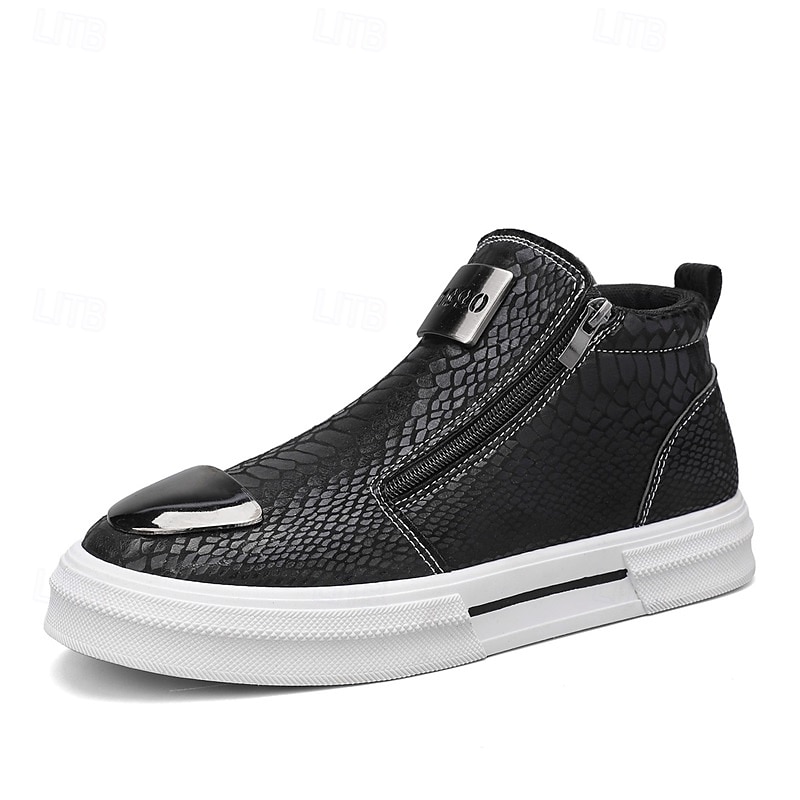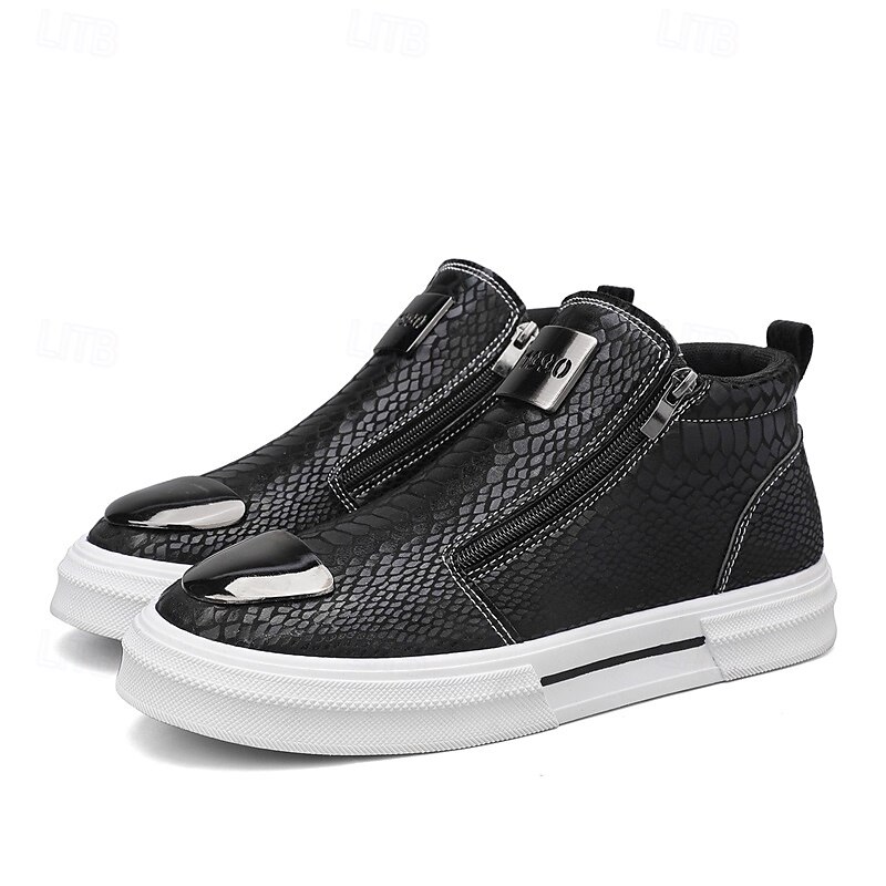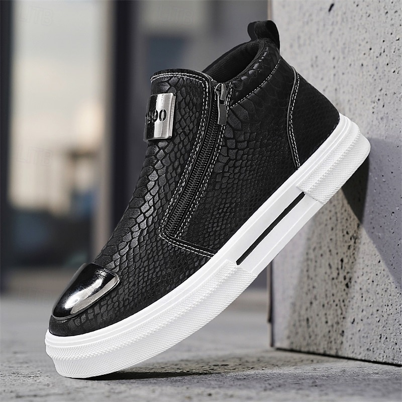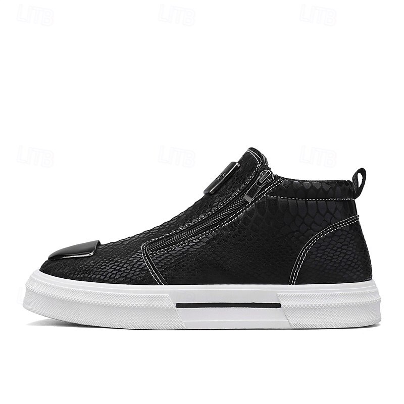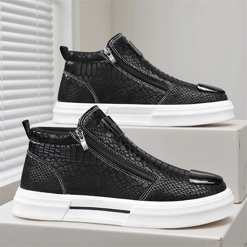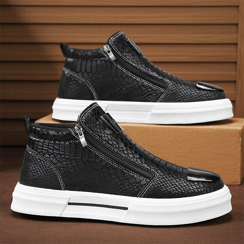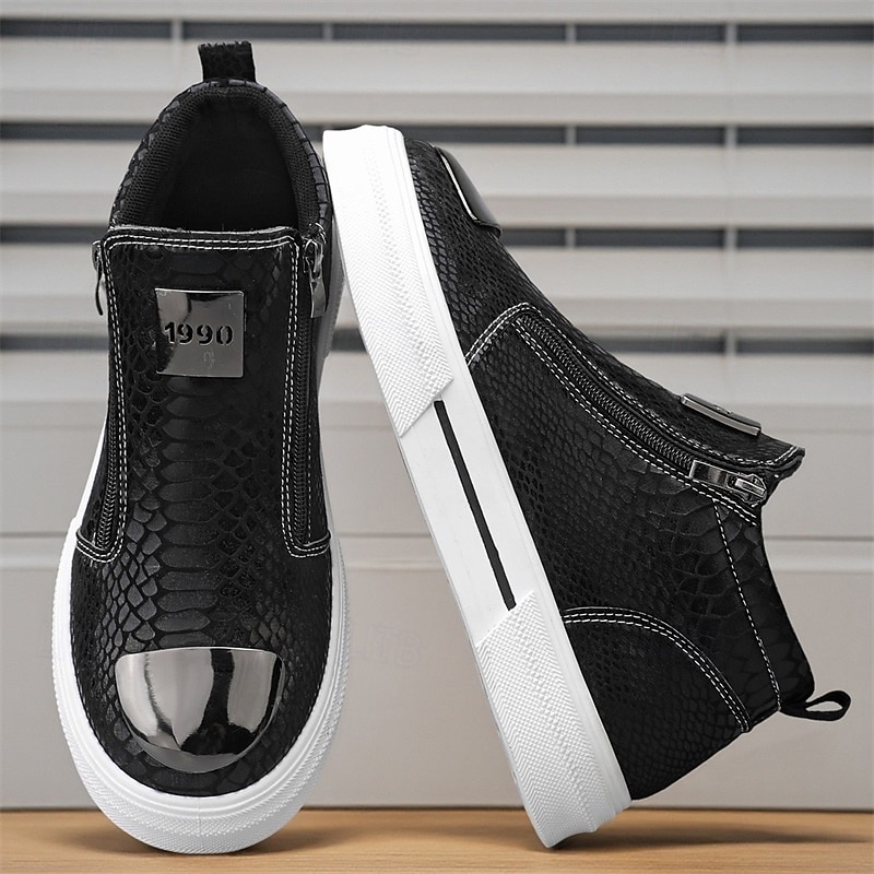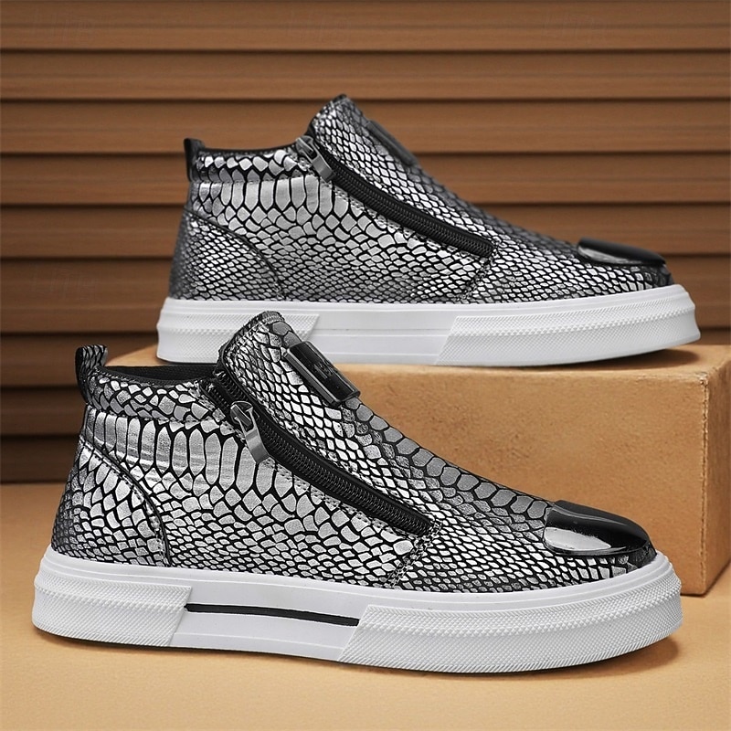 HOT ! Men's Bronze Snakeskin Pattern Slip-On Sneakers with Side Zipper, Fashion Metallic Street Shoes for Club, Party and Urban Casual Wear