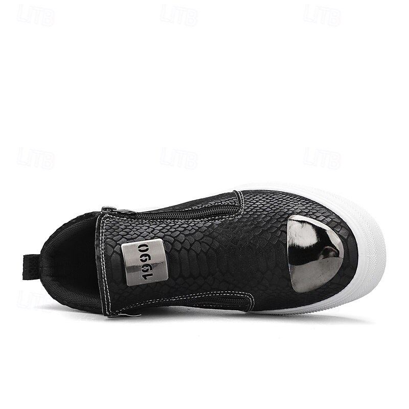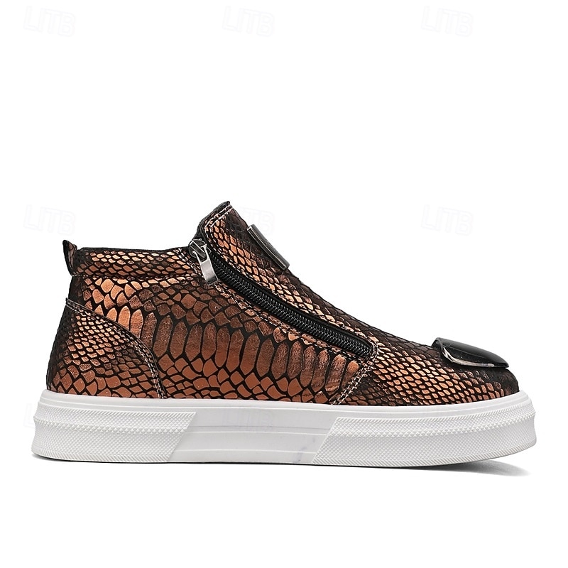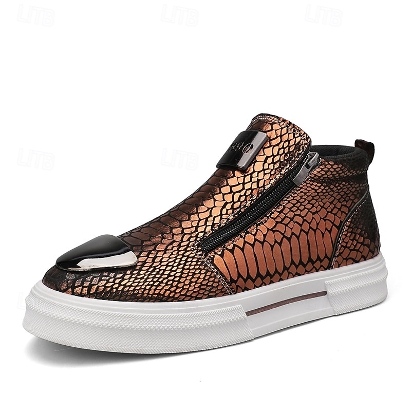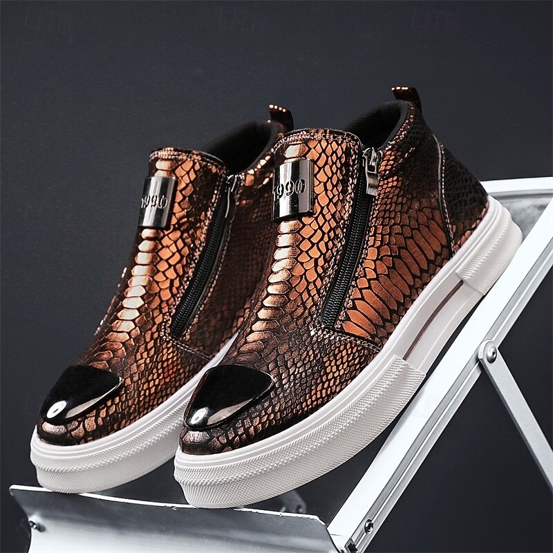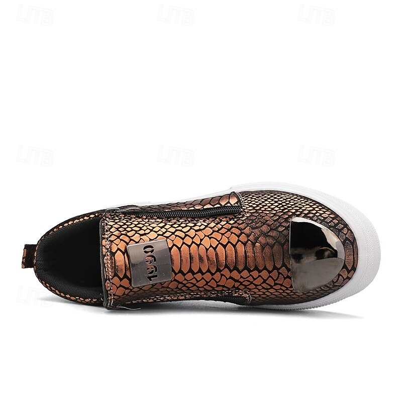 Men's Bronze Snakeskin Pattern Slip-On Sneakers with Side Zipper, Fashion Metallic Street Shoes for Club, Party and Urban Casual Wear 24