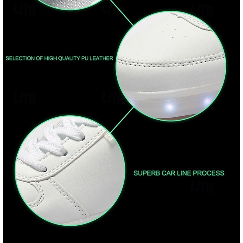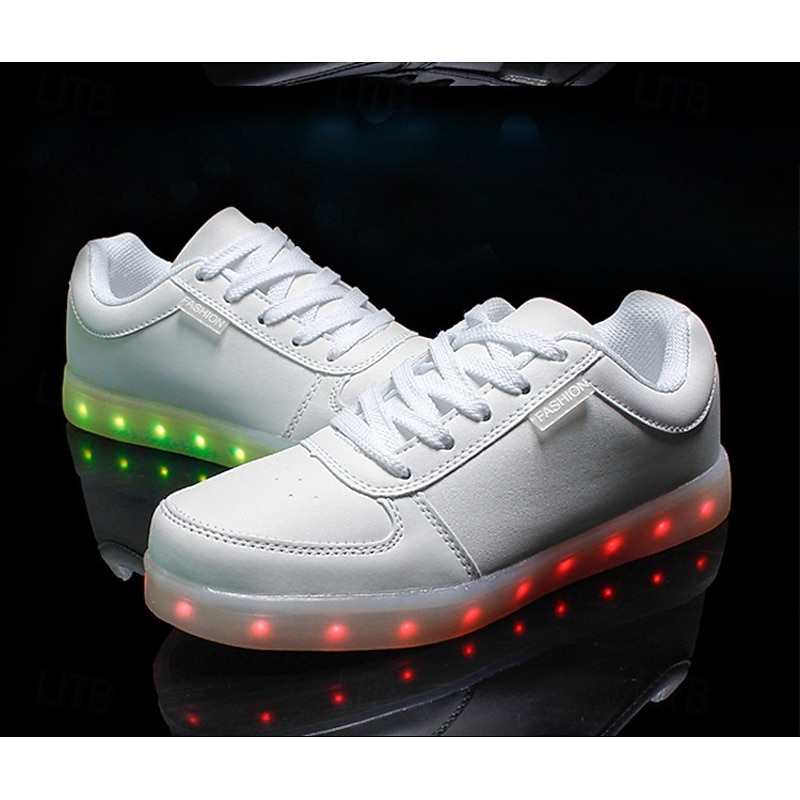Highlights [Fabric and Material] Featuring a sleek faux leather upper, these men's sneakers are crafted from high-quality PU material, giving them a glossy and stylish appearance. The durable material offers a comfortable fit perfect for everyday wear. [Silhouette and Style] These sneakers boast a classic low-top silhouette with a modern lace-up closure, ensuring a snug and secure fit. Designed as ankle boots or booties, they provide both style and practicality. [Design Highlights] The standout feature of these shoes is the LED lights embedded in the translucent sole. Capable of glowing in various colors, they create a captivating visual effect with every step, making a bold fashion statement. [Usage Scenarios] Ideal for daily wear, these LED sneakers are perfect for night outings, parties, or casual gatherings. Whether you're aiming to impress at an event or simply enjoy a vibrant style, these sneakers are a versatile choice for a variety of occasions. [Size Options] Available in an extensive size range from EU Size 36 to 50 and UK Size 14.5, these sneakers cater to a wide audience, ensuring a comfortable fit for all. Colors available include Gold, White, Black, and Silver. Perfect for everyday use. High quality materials and excellent craftsmanship ensure long-lasting durability.