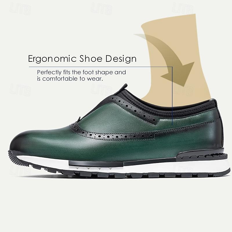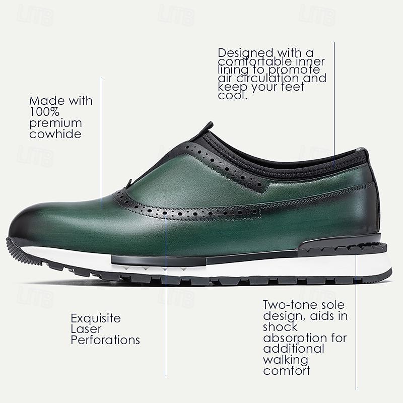 Why Choose Men's Premium Cowhide Leather Slip-On Loafers – Green and Black Brogue Design, Comfortable Cushioned Sole, Casual and Formal Shoes?