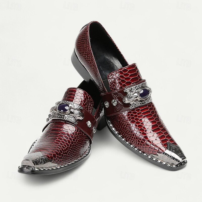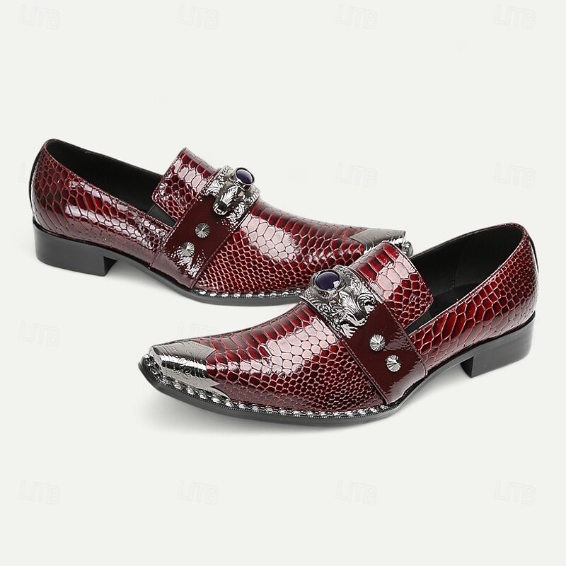 HOT ! Men's Burgundy Crocodile Pattern Leather Loafers with Metal Buckle and Gemstone Detail, Luxury Dress Shoes for Weddings, Parties and Formal Occasions