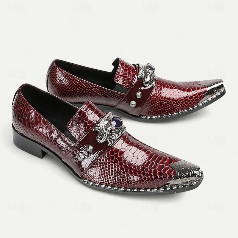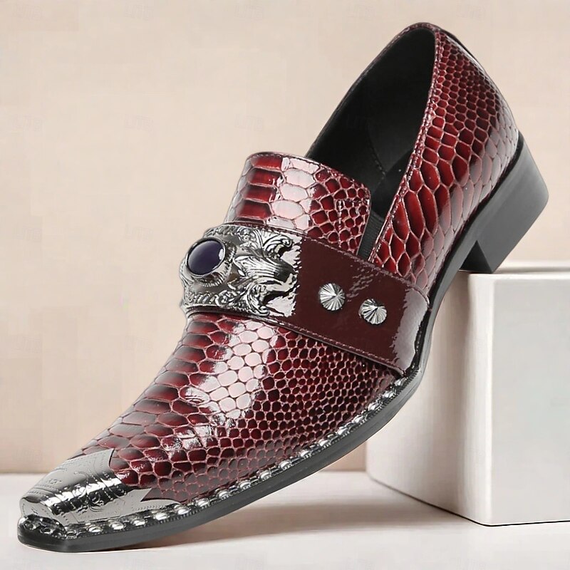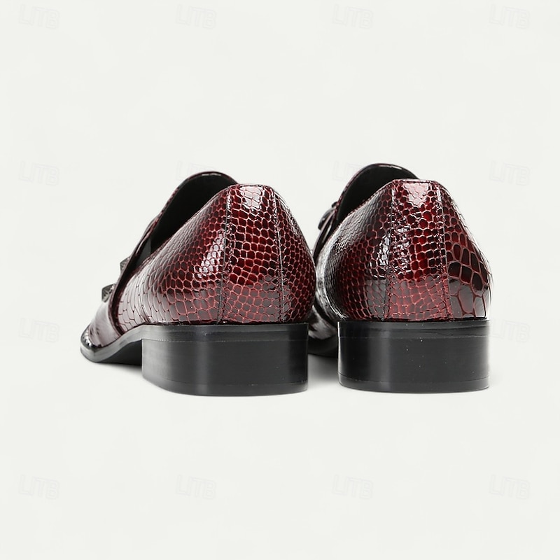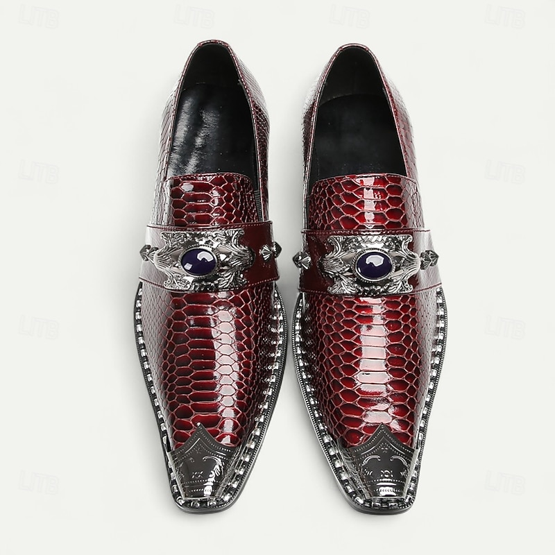 More information about Men's Burgundy Crocodile Pattern Leather Loafers with Metal Buckle and Gemstone Detail, Luxury Dress Shoes for Weddings, Parties and Formal Occasions
