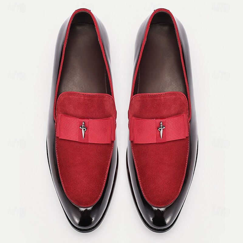 Men's Premium Cowhide Loafers with Red Suede Accent and Bow Detail – Luxury Formal Slip-On Dress Shoes 6
