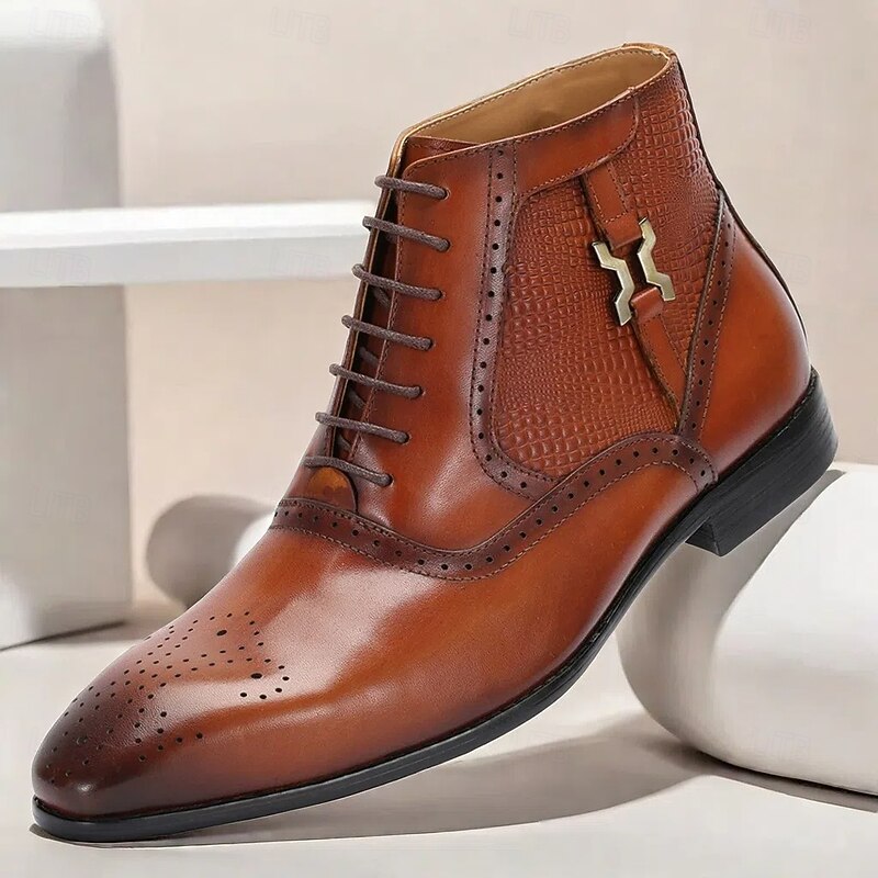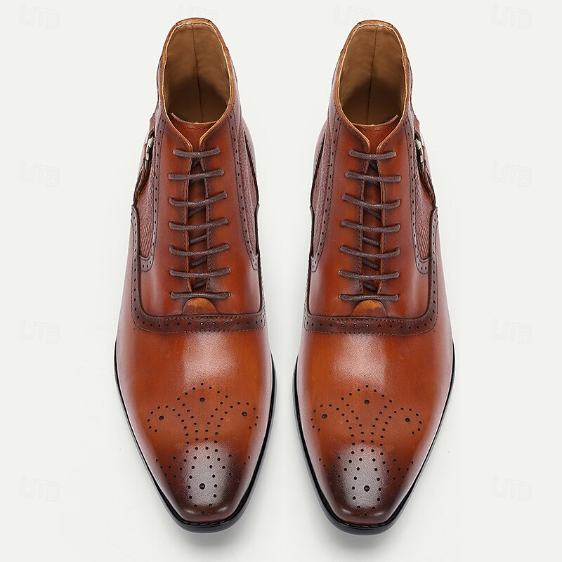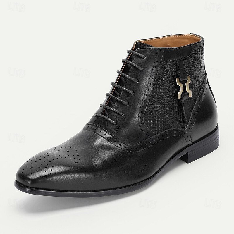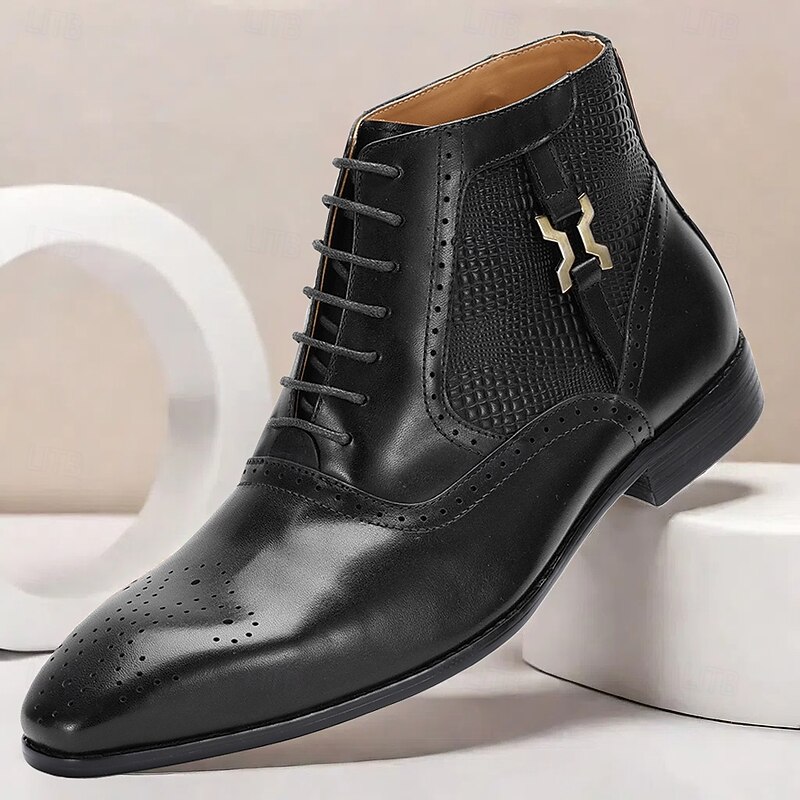 Highlights [Fabric] Crafted from premium 100% cowhide leather, these men's boots offer a luxurious feel and exceptional durability. The rich texture of the leather is complemented by a distinctive crocodile-embossed pattern, imparting a refined and stylish appearance. [Fit] These boots feature a classic lace-up design, ensuring a snug and adjustable fit. The round toe shape provides ample space for comfort, making them ideal for prolonged wear. [Design Highlights] The boots are adorned with intricate brogue detailing along the toe cap and sides, offering a sophisticated look. A subtle metallic emblem adds a touch of elegance, while the decorative metal accent enhances the overall aesthetic. The combination of smooth and textured leather enhances the visual appeal, making these boots a standout piece. [Occasions] Perfect for both formal and casual settings, these boots effortlessly complement business attire and elevate everyday outfits. Whether worn for daily activities or special occasions, these boots add a polished and stylish touch to any ensemble. [Size Range] Available in a wide range of sizes to accommodate various preferences, from US6 / EU39 / UK5 to US13 / EU46 / UK12, ensuring a comfortable fit for every wearer.