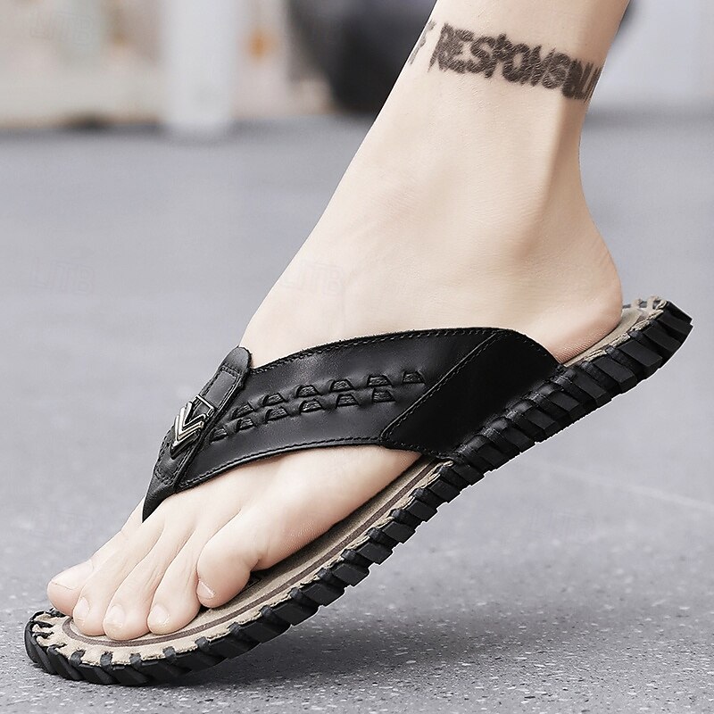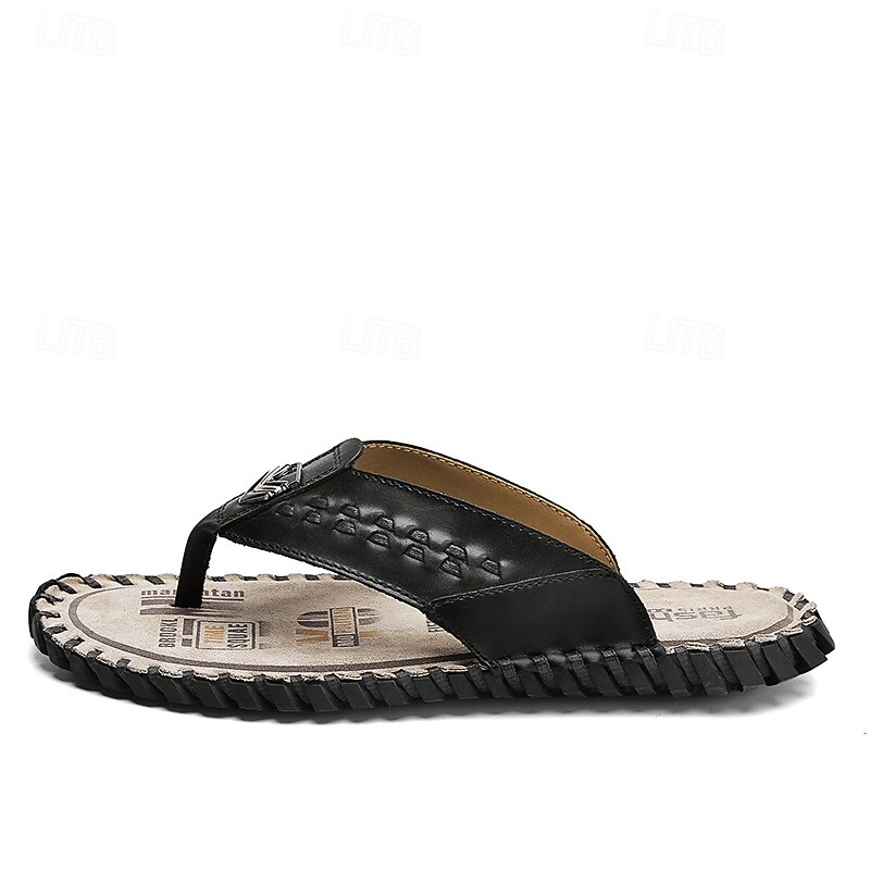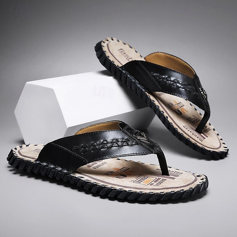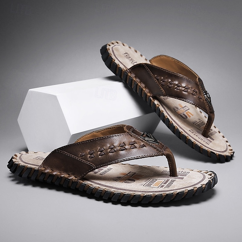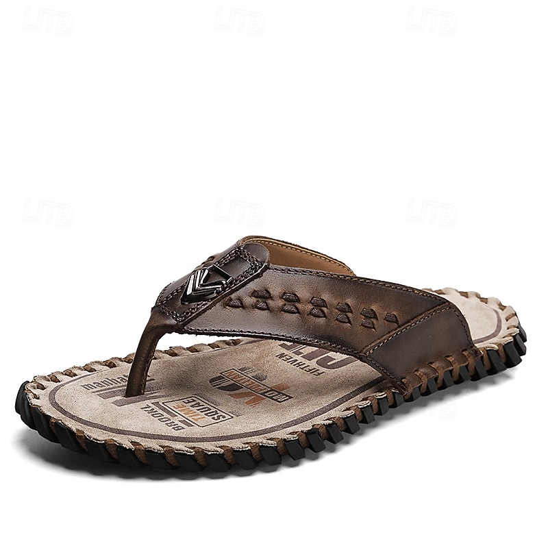 HOT ! Men's Brown Faux Leather Flip-Flop Sandals – Comfortable and Durable with Adjustable Strap and Textured Sole, Ideal for Casual Wear, Beach and Outdoor Activities