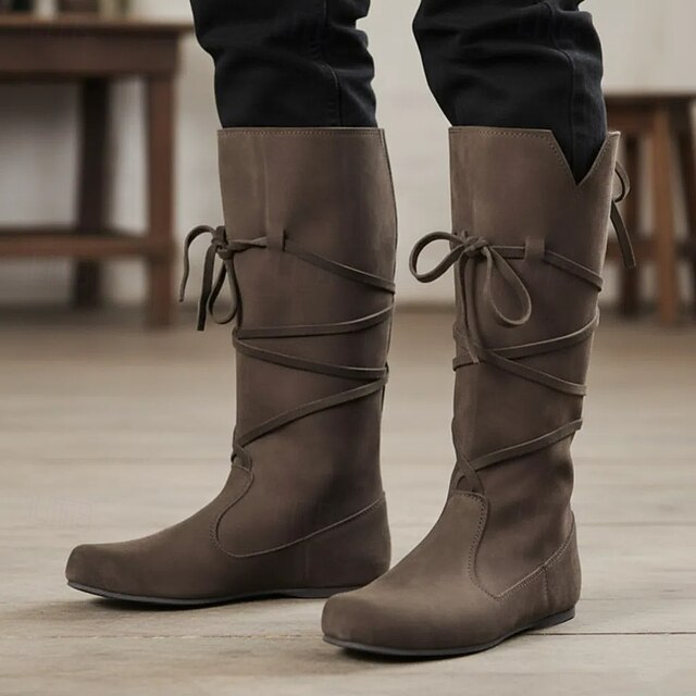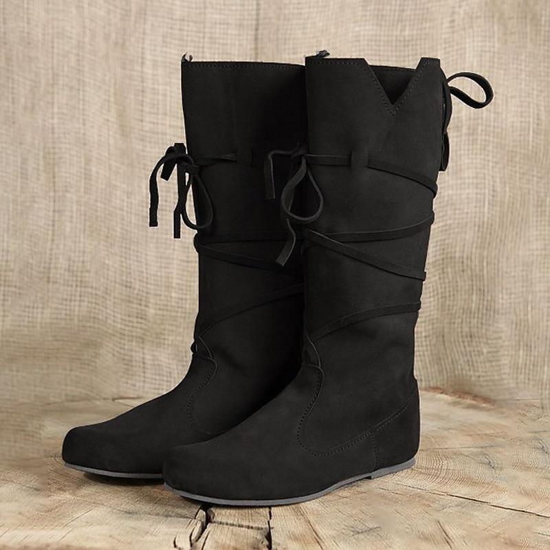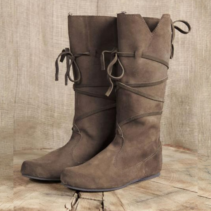 Highlights [Fabric] : Crafted from premium faux leather, these medieval-style boots provide both a soft and luxurious feel. The high-quality material ensures durability and comfort, making them perfect for wearing in either fall or winter. [Fit] : Featuring a classic mid-calf design, these boots offer a relaxed and slouchy fit that combines style with ease of wear. Their flat soles ensure comfort throughout the day, while maintaining a fashionable look. [Design Highlights] : These boots are adorned with sleek wrap-around laces that capture a rustic and fashionable touch, complemented by a round toe for a more casual appearance. The versatile, solid-color design in earthy tones like brown and black makes them easy to pair with a variety of outfits, whether you're aiming for a modern or medieval style. [Occasions] : Ideal for a range of events, from daily outdoor activities to themed gatherings like Renaissance fairs and cosplay events. Whether you’re walking through the city or attending a medieval-themed gathering, these boots add the perfect balance of charm and functionality. [Size Range] : Available in a variety of sizes to suit different needs, from US 5.5 / EU 35 / UK 3.5 to US 12 / EU 45 / UK 11, ensuring a comfortable fit for a wide range of foot sizes.