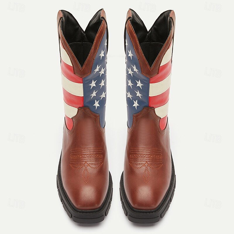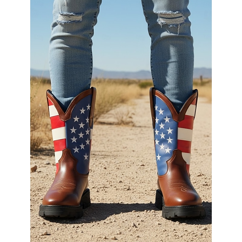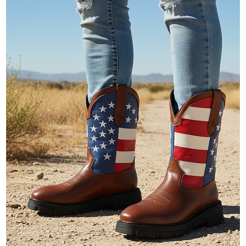 Highlights [Fabric] : Constructed from premium PU materials, these boots offer the durability and high-quality finish expected from faux leather products. The PU lining further enhances the comfort, making these boots suitable for all-day wear. [Fit] : Designed with a standard fit, these mid-calf boots cater to those seeking both style and practicality. The standard size suggestion allows you to choose your usual size confidently, ensuring a comfortable fit. [Design Highlights] : Featuring a striking American flag-inspired design, these cowboy boots embody a patriotic spirit with their bold pattern of blue and white stars alongside red and white stripes. The smooth brown texture on the lower portion seamlessly blends tradition with modern style, while the rugged rubber sole provides excellent traction. [Occasions] : Perfect for outdoor and casual wear, these boots make a statement at any event. Whether for daily wear, walking, or highlighting a stylish ensemble during spring and fall, their versatility shines through. [Size Notice] : Available in a range of sizes from US6 to US12, these boots provide options for various foot sizes, ensuring every wearer can enjoy their patriotic style and robust design.