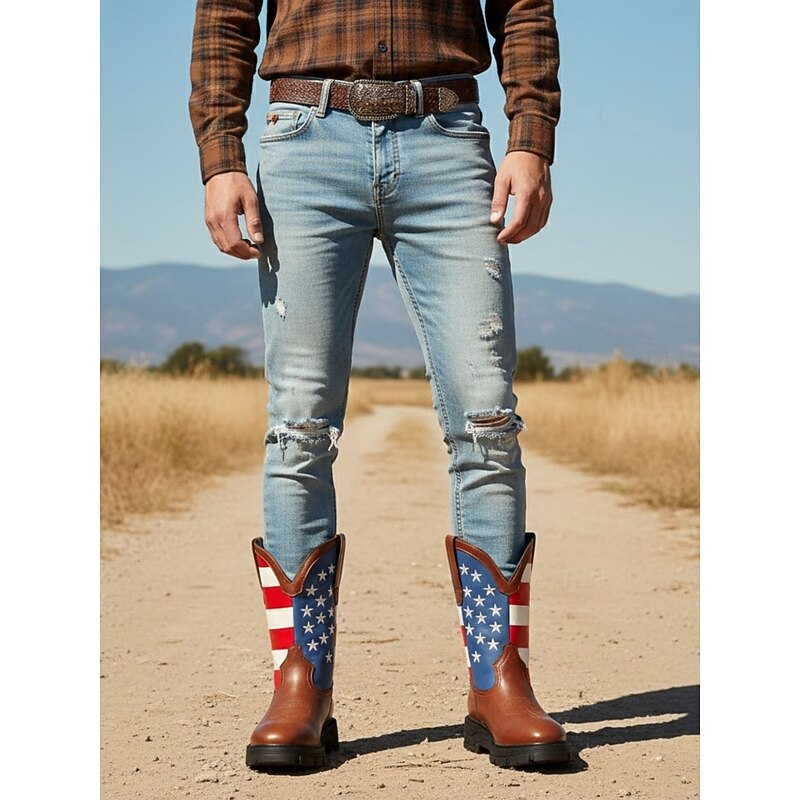 Men's American Flag Western Cowboy Boots with Rugged Sole - Patriotic Faux Leather Boots for Outdoor and Casual Wear 1