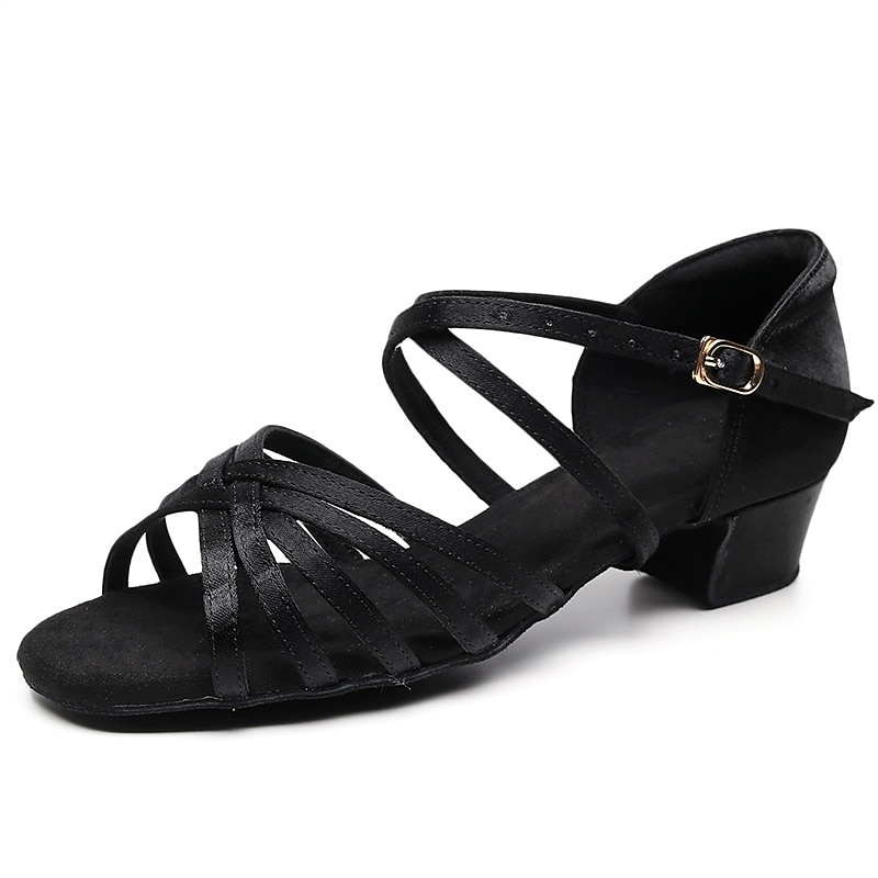 Highlights [Fabric] : Crafted from high-quality satin, these women's Latin dance shoes offer a subtle shine and smooth texture, ensuring both durability and an elegant appearance. The satin material is complemented by a fabric lining, providing comfort during extended wear. [Fit] : Designed with a supportive low thick heel, these shoes provide excellent balance and stability, making them ideal for a variety of dance styles. The peep-toe shape and open-toe sandal design add both style and functionality. [Design Highlights] : Featuring delicate crisscross straps and an adjustable ankle strap with a secure buckle closure, these shoes offer a customizable fit for enhanced comfort during movement. The 1.38'' (3.5cm) thick heel provides a perfect blend of height and support, while the suede outsole ensures smooth gliding on the dance floor. [Occasions] : Perfect for indoor and professional dance events such as Samba, ChaCha, and Rumba. Whether for practice sessions or performances, these shoes are an excellent choice for both adult and children's dance activities. [Size Range] : Available in an extensive range of sizes, from US1.5/EU31 to US9/EU40, these shoes accommodate various foot sizes. It is recommended to select your usual size for the best fit. They are offered in classic colors like black, white, and brown to complement any dance outfit.