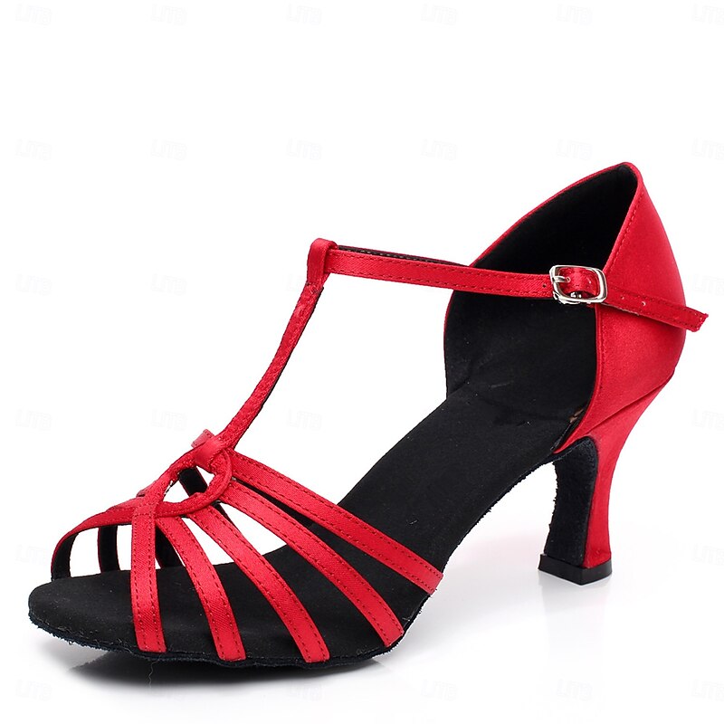 Highlights [Fabric] Crafted with a glossy satin upper and a comfortable fabric lining, these women's Latin dance shoes deliver an elegant and sophisticated look, ideal for any dance event. [Silhouette] Designed in an open-toe style with multiple crisscross straps, these shoes ensure a secure fit, while the mid-height Cuban heel offers both stability and flair, perfect for professional and social dancing. [Design Highlights] Featuring an intricate strappy design with an ankle buckle closure, these shoes offer adjustable support, allowing for comfortable wear throughout rigorous dance routines. The curved heel enhances the shoe's aesthetic, balancing functionality with elegance. [Occasions] Perfect for salsa, ballroom, tango, and other dance performances. These shoes are designed to provide dancers with both comfort and elegance, making them an excellent choice for dance enthusiasts seeking to impress on the dance floor. [Size Notice] Available in sizes ranging from US5 (EU35) to US9 (EU40), these shoes are crafted to standard sizing. For those with wider feet, it is recommended to consider sizing up for the best fit.