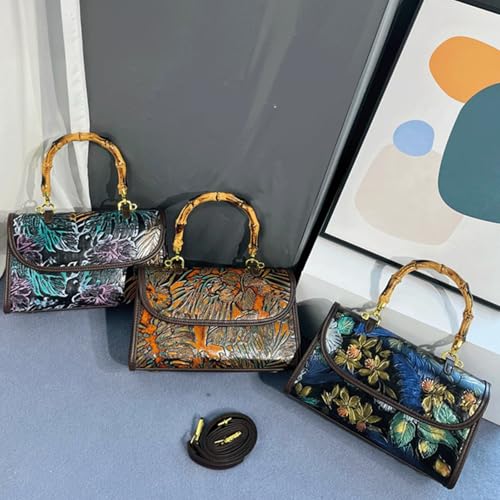 HOT ! Bamboo Handle Purse for Woman Retro Floral Embossed Handbag Crossbody Vintage Elegant Purses Top Handle Satchel Bag