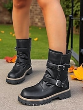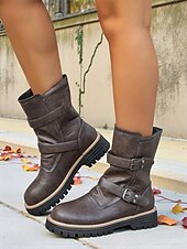 More information about Women's Dark Brown Faux Leather Mid-Calf Boots with Buckle Straps and Chunky Non-Slip Sole, Stylish Outdoor Motorcycle Combat Boots for Fall & Winter Casual Wear