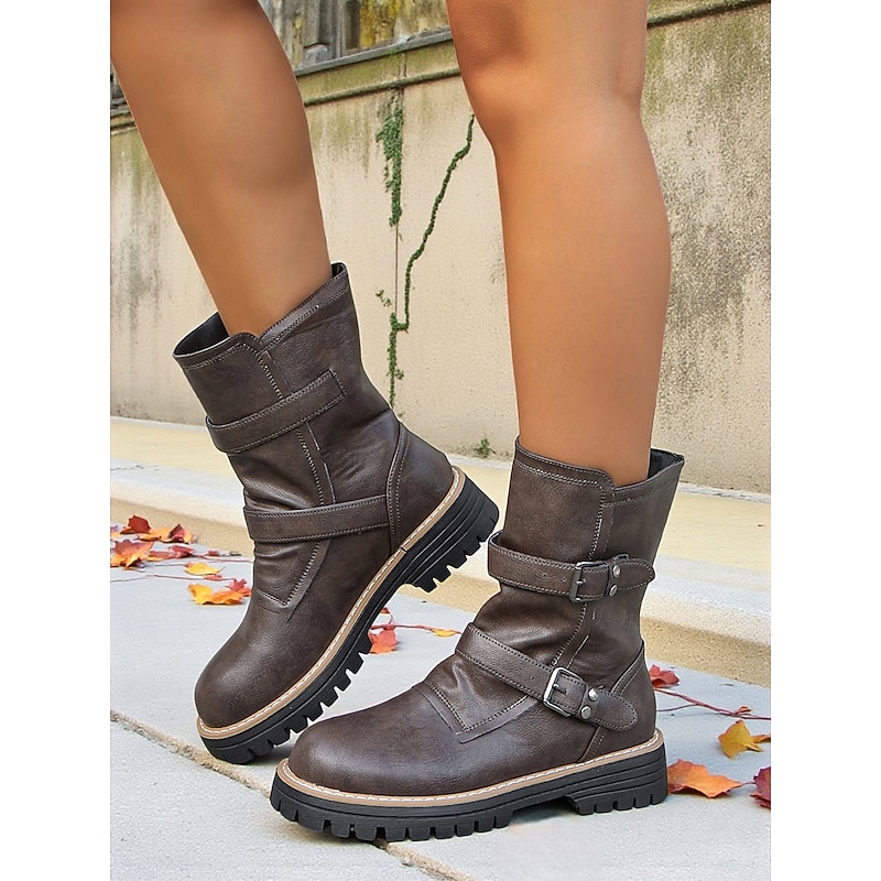 HOT ! Women's Dark Brown Faux Leather Mid-Calf Boots with Buckle Straps and Chunky Non-Slip Sole, Stylish Outdoor Motorcycle Combat Boots for Fall & Winter Casual Wear