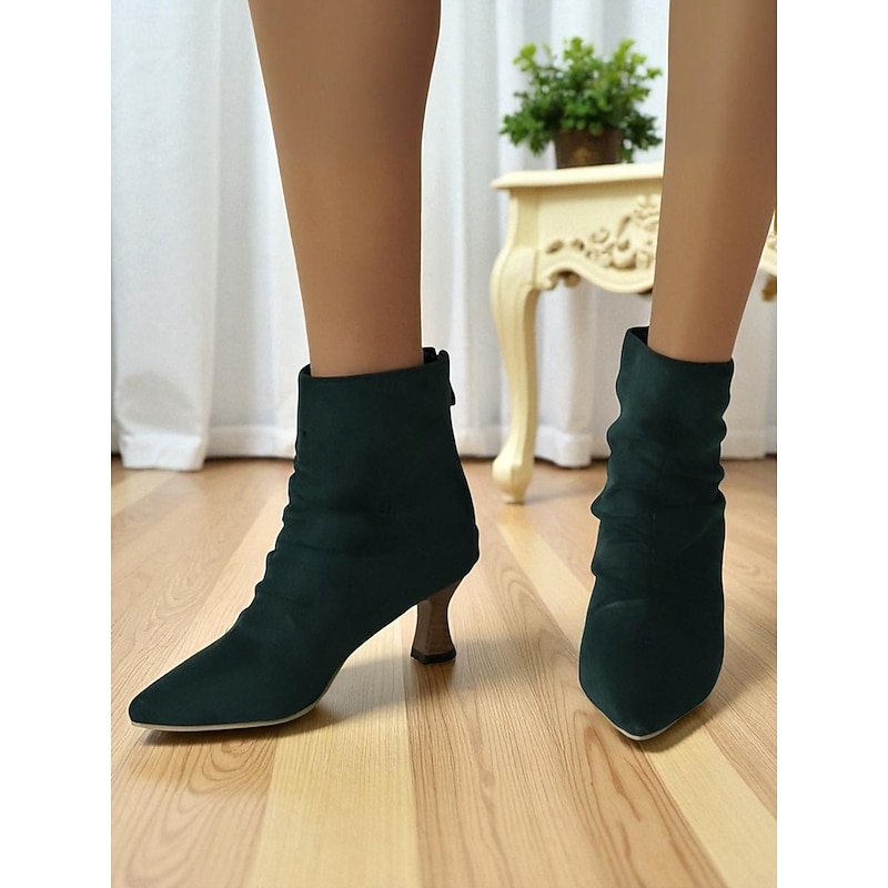 Women's Green Faux Leather Pointed Toe Ankle Boots with Ruched Design and Kitten Heels – Elegant Vintage Style Booties for Fall Office Outfits and Evening Wear 12