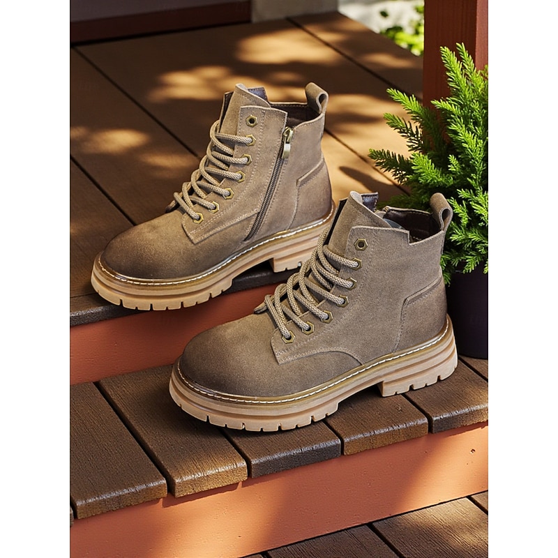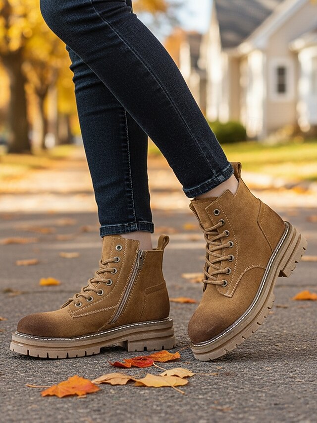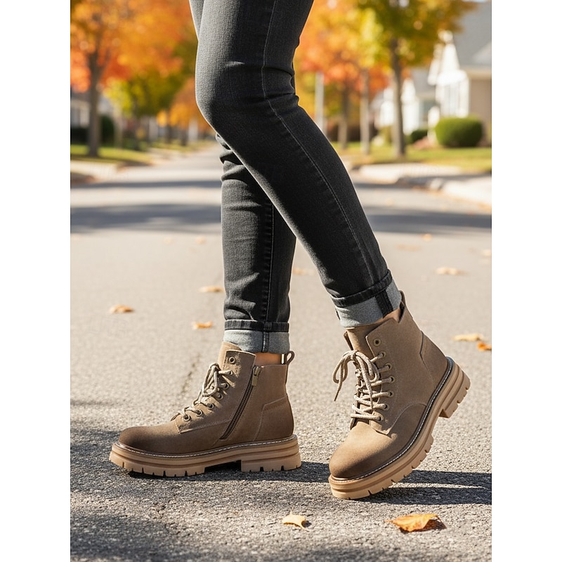 HOT ! Women's Brown Suede Lace Up Ankle Boots with Chunky Non Slip Sole -Casual Outdoor Workwear Hiking Boots for Fall and Winter