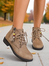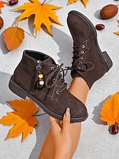 More information about Women's Dark Brown Lace-Up Ankle Boots with Side Zipper and Beaded Tassel Detail, Comfortable Low Heel City Nomadic Style Faux Suede Boots for Casual Daily Outfits Wear