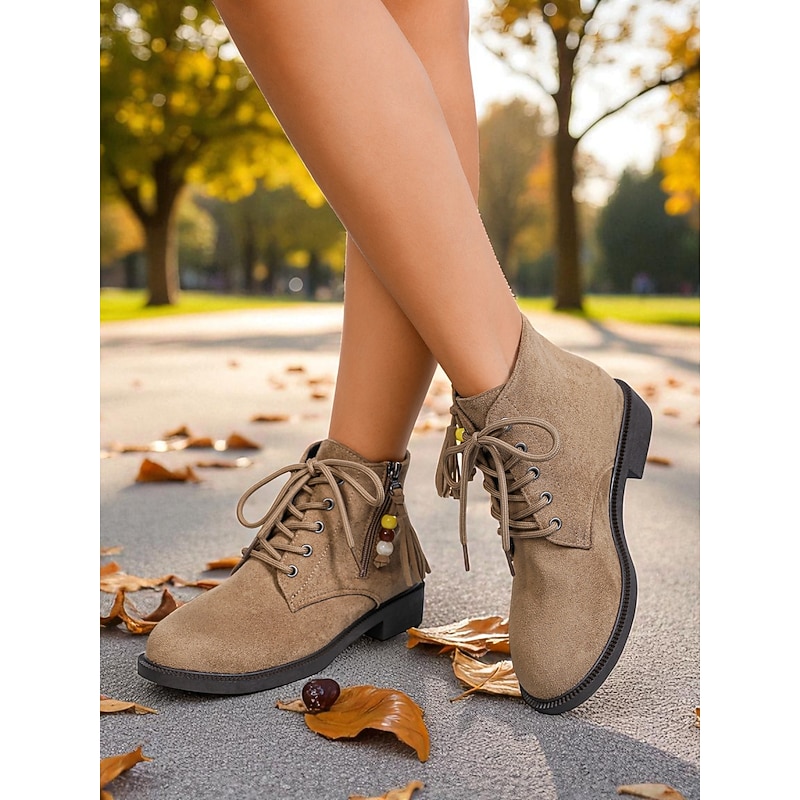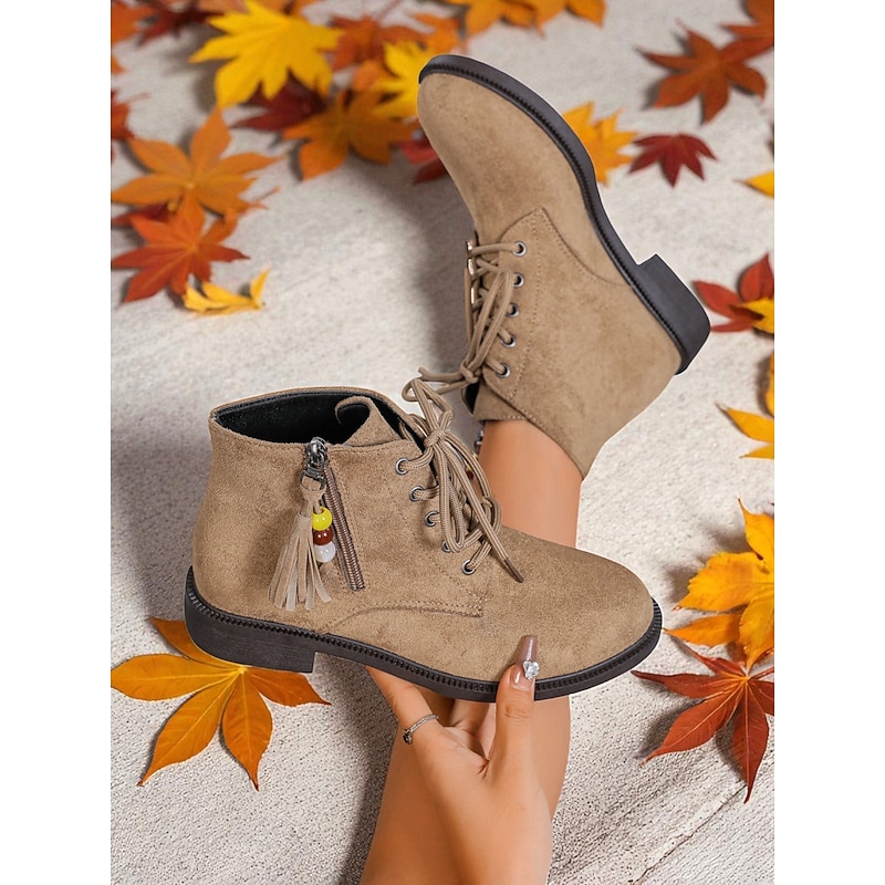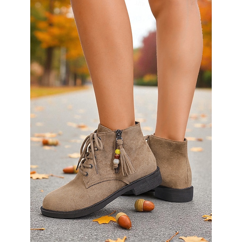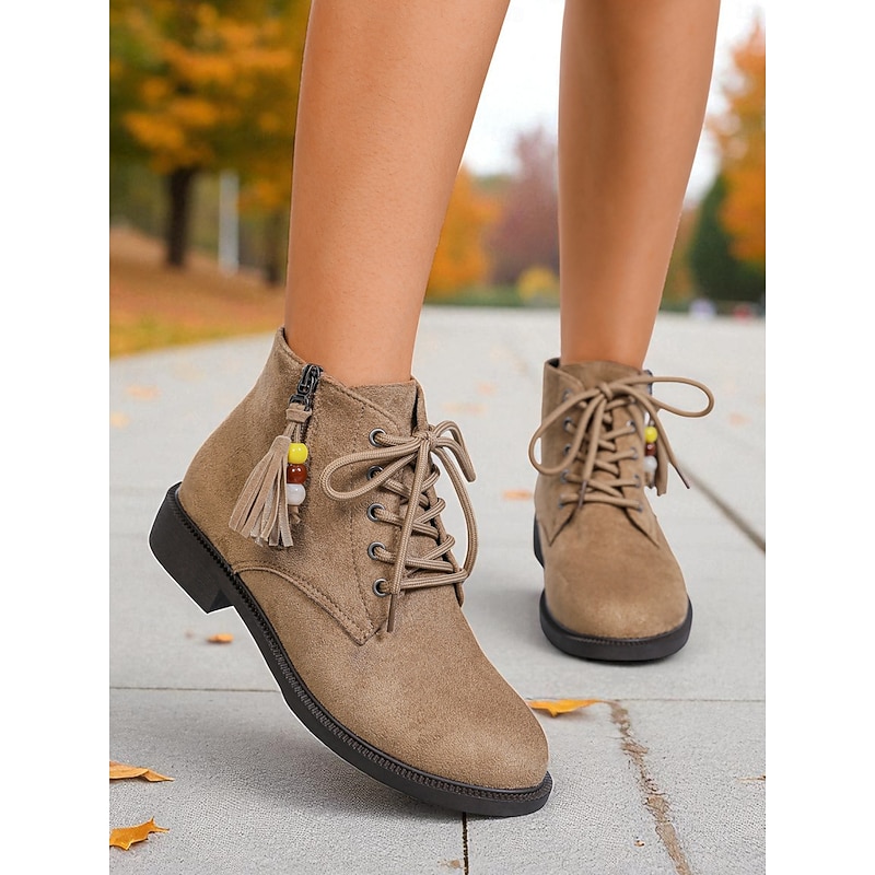 HOT ! Women's Dark Brown Lace-Up Ankle Boots with Side Zipper and Beaded Tassel Detail, Comfortable Low Heel City Nomadic Style Faux Suede Boots for Casual Daily Outfits Wear